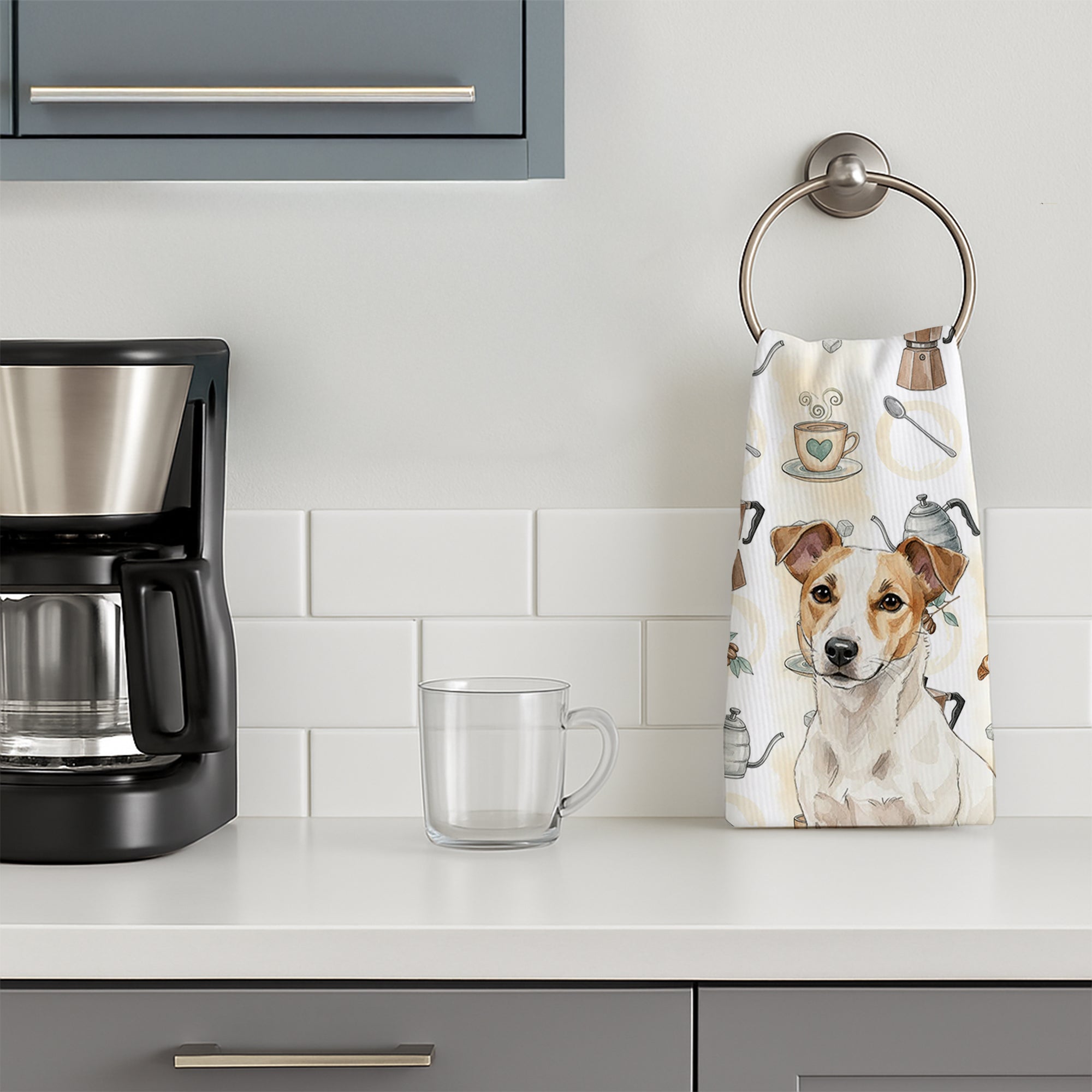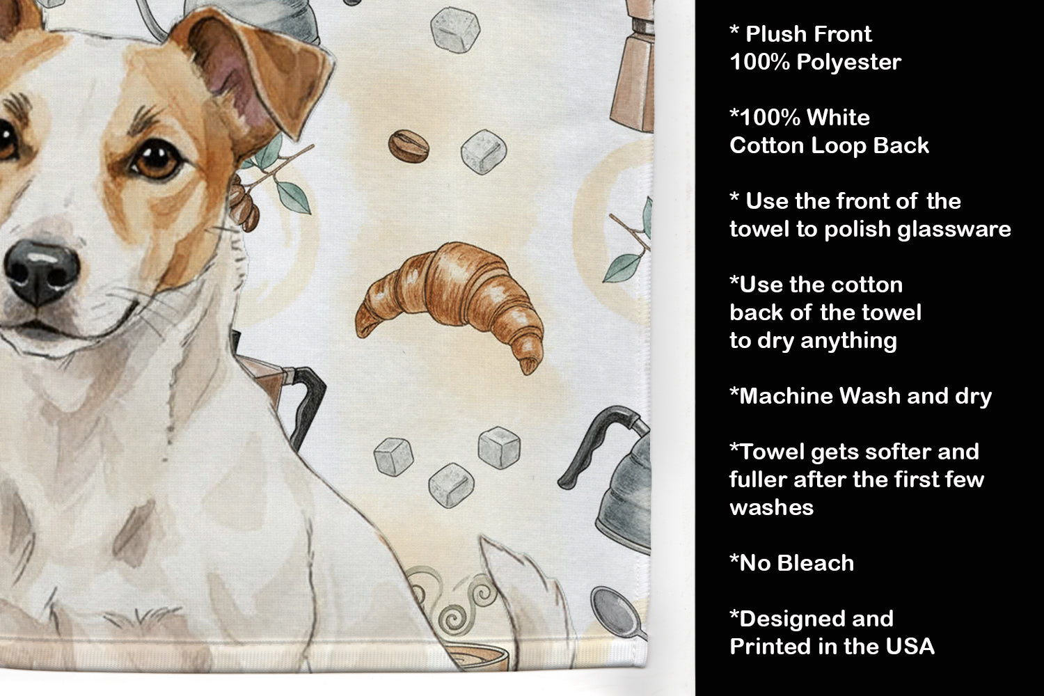 Kitchen Towel featuring breed specific Jack Russell Terrier artwork. Start your morning with charm and function thanks to our Coffee Time Kitchen Towel Collection. Featuring playful watercolor artwork of coffee pots, cups, croissants, and a dog portrait, these towels bring warmth and personality to your kitchen or bath. Crafted with a plush minky polyester front that polishes glassware to a shine, and a 100% cotton terry loop back for absorbency, they combine durability with practicality. Artwork is permanently dyed into the fibers to keep colors fresh wash after wash. Measuring 15" x 25", these machine-washable towels are finished with bound edges to hold their shape. Designed and printed in the USA, they’re perfect for kitchens, coffee bars, guest baths, or as thoughtful gifts for dog lovers and coffee enthusiasts alike.