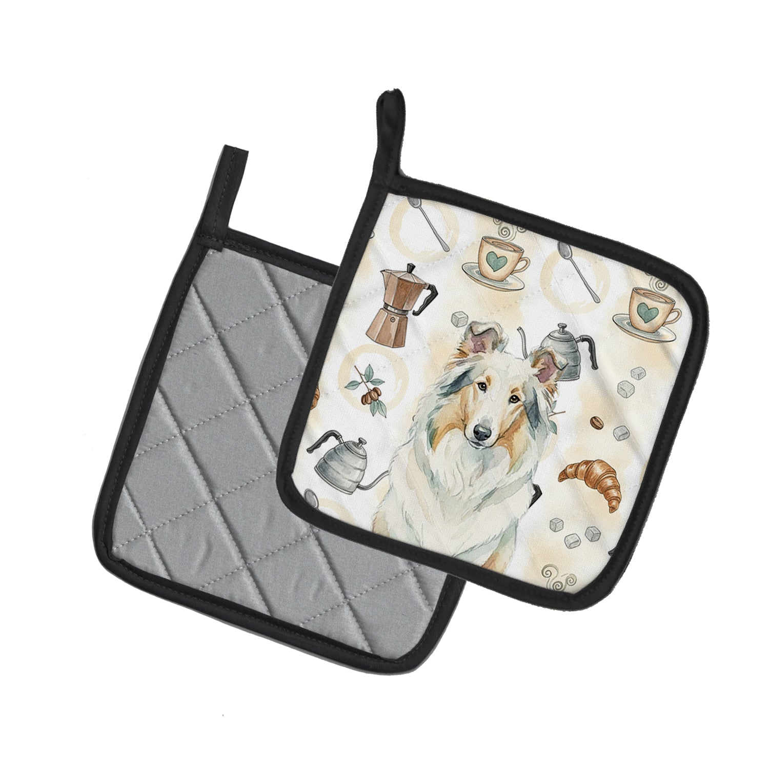 Pair of Pot Holders featuring breed specific Collie artwork. Add warmth, personality, and function to your kitchen with our Coffee Time Pot Holder Pair. Each set includes two quilted hot pads, featuring original full-color watercolor artwork on a soft polyester front accented by black trim. Crafted with multiple layers for performance: Top Layer: Vibrant artwork permanently dyed into polyester fabric. Middle Layer: US-manufactured insulated material with breathable polyester fibers and a reflective metalized film that reflects heat back to its source. Bottom Layer: A silver heat-resistant backing for extra protection. Each pot holder measures 7.5" x 7.5", includes a hanging tab, and is quilted for durability. Use them to protect your hands, countertops, and tabletops — or as decorative trivets for Thanksgiving, Christmas, or everyday meals.