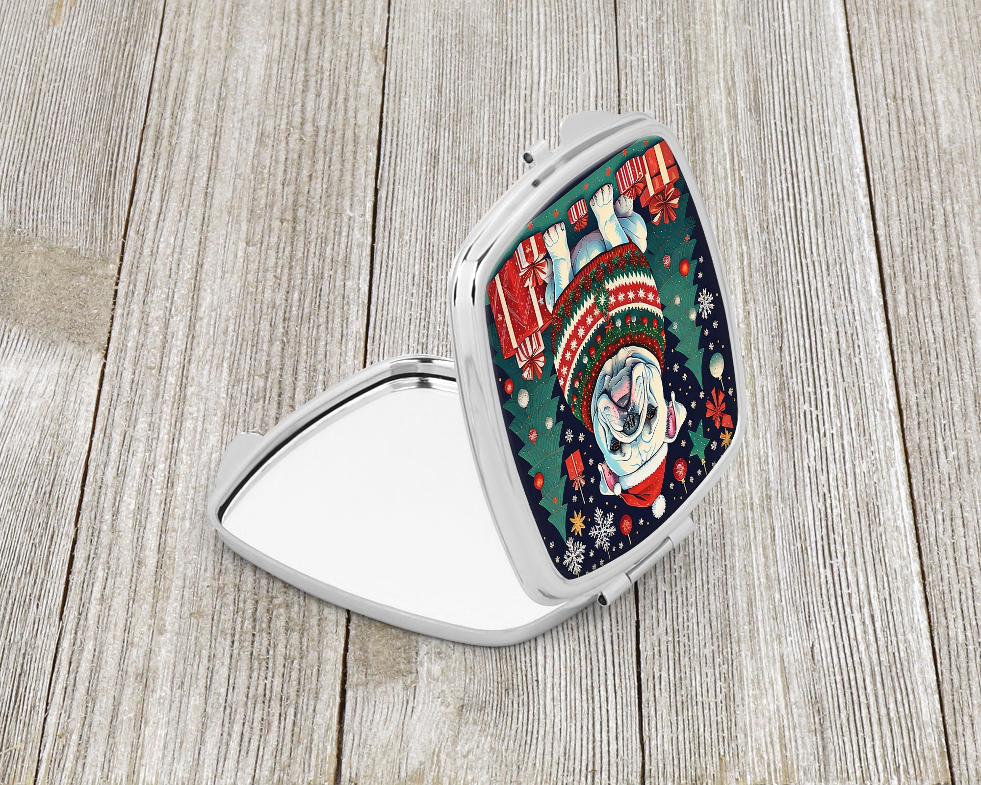 Decorate your space with our Christmas English Bulldog artwork on a Compact Mirror. Introducing our Square Compact Mirror, a blend of elegance, functionality, and compactness, perfect for on-the-go touch-ups. This Silvertone metal mirror, with dimensions of 2.75 inches x 3 inches x .3 inches, fits effortlessly into your purse, handbag, or pocket, ensuring that you can check your appearance anytime, anywhere. Our compact mirror stands out with its eye-catching artwork on the front, adding a dash of style to this practical accessory. It is more than just a mirror; it's a statement piece that reflects your personality and aesthetic. When opened, this compact reveals two mirrors inside, doubling your perspective for precise touch-ups. The Silvertone metal construction ensures durability while maintaining a lightweight feel, making it an ideal everyday carry item. Whether you're rushing to a meeting, prepping for a dinner date, or just need a quick check on your look, our Square Compact Mirror is your reliable companion. Experience the perfect blend of style and practicality with this must-have accessory.