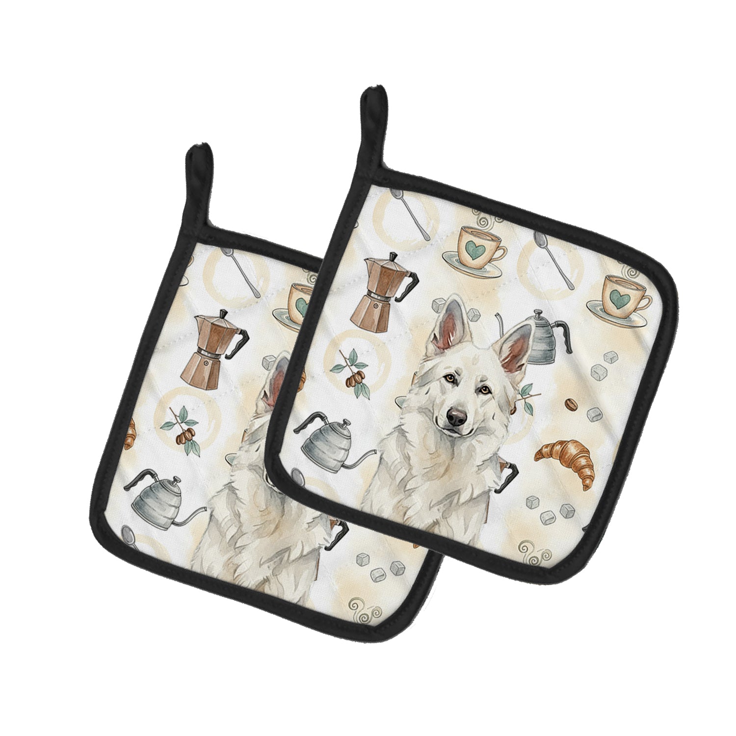 Pair of Pot Holders featuring breed specific German Shepherd artwork. Add warmth, personality, and function to your kitchen with our Coffee Time Pot Holder Pair. Each set includes two quilted hot pads, featuring original full-color watercolor artwork on a soft polyester front accented by black trim. Crafted with multiple layers for performance: Top Layer: Vibrant artwork permanently dyed into polyester fabric. Middle Layer: US-manufactured insulated material with breathable polyester fibers and a reflective metalized film that reflects heat back to its source. Bottom Layer: A silver heat-resistant backing for extra protection. Each pot holder measures 7.5" x 7.5", includes a hanging tab, and is quilted for durability. Use them to protect your hands, countertops, and tabletops — or as decorative trivets for Thanksgiving, Christmas, or everyday meals.