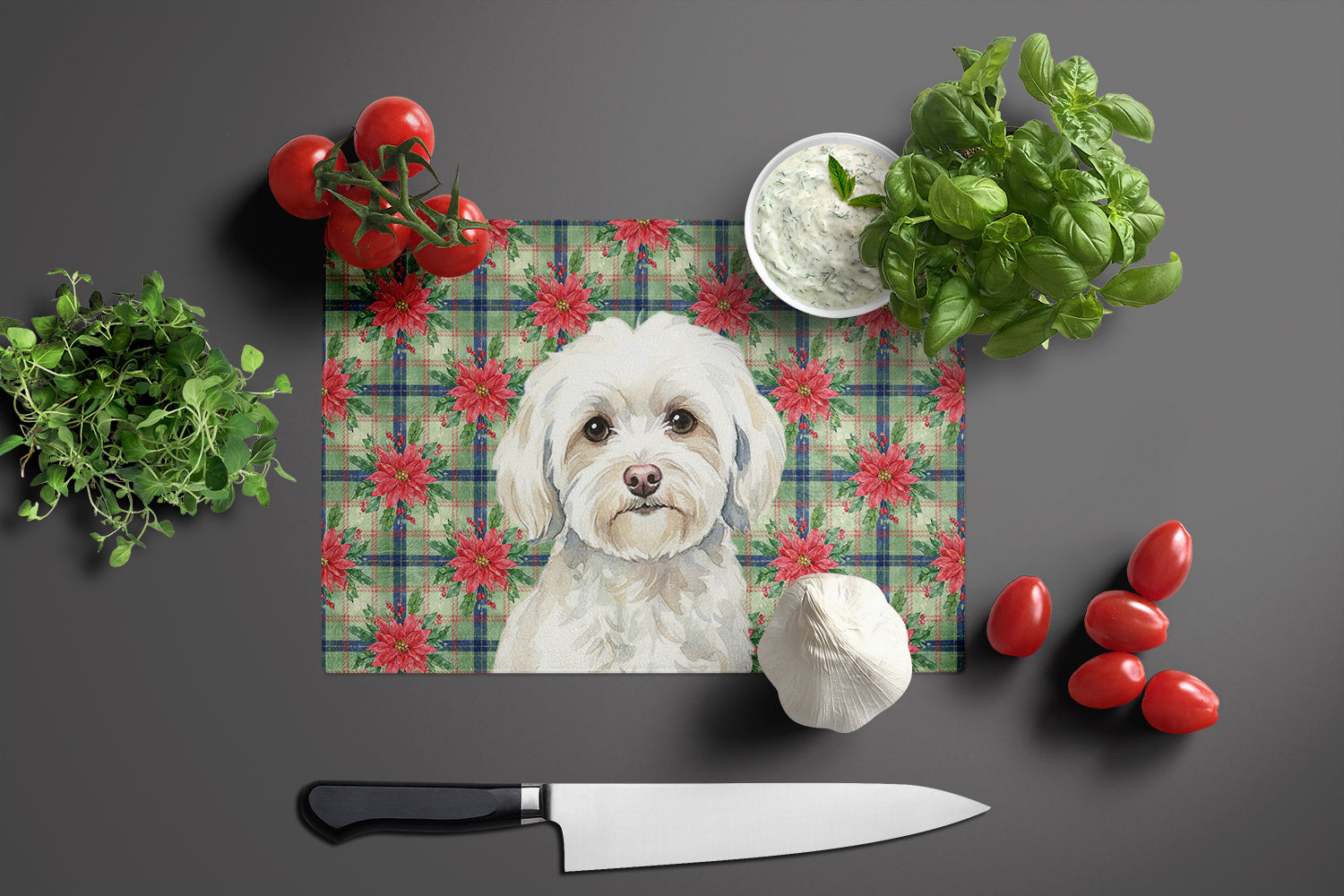 Glass Cutting Board featuring breed specific Havanese artwork. Celebrate Christmas with this Christmas Cutting Board. Introduce your kitchen to the vibrant, large Decorative Glass Cutting Board from Caroline's Treasures. Crafted from resilient tempered glass, this board is not only a utilitarian necessity but also a colorful art piece. With its generous dimensions of 15 inches in height and 11 inches in length, it offers ample space for all your cutting needs. Every piece showcases captivating artwork from distinguished artists, bringing an aesthetic edge to your kitchen. Beyond its attractive design, this cutting board ensures your countertop stays pristine and unscathed, owing to its heat-resistant properties. Engineered with user convenience in mind, it features non-skid feet for stability, and rounded corners for additional safety. Its robust construction renders it virtually unbreakable, guaranteeing longevity. The board comes with protective feet bumpers, maintaining its position during use. This product is recommended to be hand washed only. Proudly printed and assembled in the United States, this cutting board exemplifies superior craftsmanship. With Caroline's Treasures' Decorative Glass Cutting Board, you're investing in a blend of functionality and artistic flair.