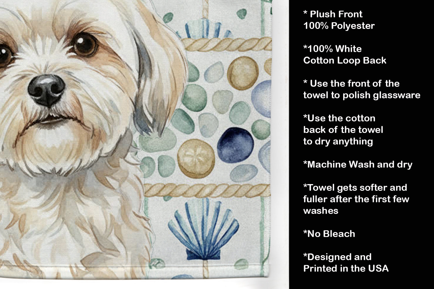 Kitchen Towel featuring breed specific Lhasa Apso artwork. Bring breezy coastal charm to your kitchen or bath with our plush velour towel featuring original watercolor artwork. The soft minky polyester front showcases vivid seashell and starfish designs with a dog portrait, perfect for polishing glassware to a brilliant shine. The 100% cotton terry loop back delivers superior absorbency for drying hands, dishes, or counters. Artwork is dyed directly into the fibers for lasting color that won’t crack or peel. Each towel measures 15" x 25", with bound edges to maintain shape after repeated washes. Machine washable and tumble dry low for easy care. Designed and printed in the USA, these towels combine function and style—ideal for beach homes, coastal kitchens, or as thoughtful gifts.