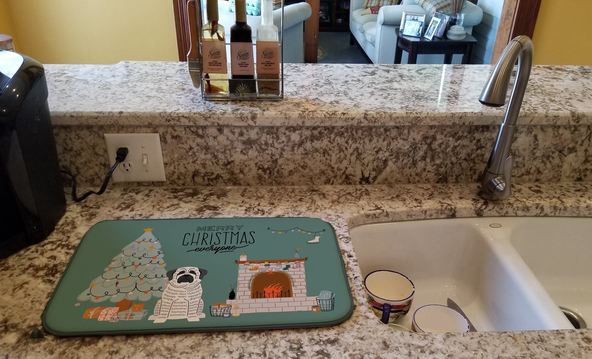 Decorate your space with our Christmas Mastiff artwork on a Dish Drying Mat. Say goodbye to messy countertops and soggy dish towels with our innovative dish drying mat. Our high-quality dish drying pad is designed to keep your countertops dry while offering a stylish and efficient solution. Whether you're air drying dishes, glasses, stemware, silverware, pots, pans, bottles, or even fruits and vegetables, our dish mat is the perfect choice. The 14 inches x 22 inches size fits most counters and dish drying racks, and the non-slip design ensures stability. Made with water-absorbent polyester and a polyurethane foam insert, our dish drying mat is not only functional but also durable. It's machine washable and printed in the USA for long-lasting use. The beautiful artwork adds flair to your kitchen decor, making it a perfect housewarming gift or present for any occasion. Upgrade your kitchen experience with our absorbent and versatile dish drying mat.