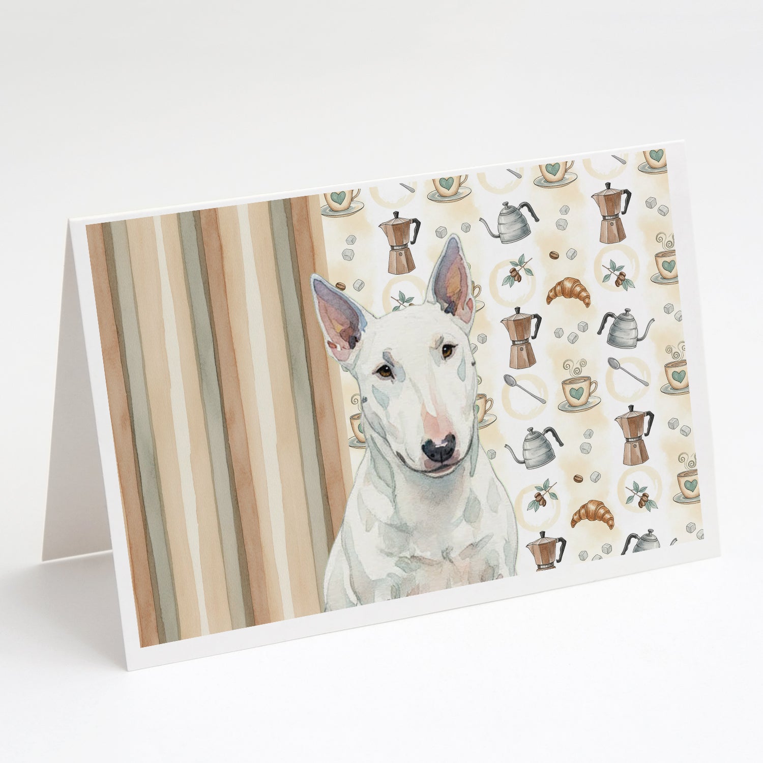 Shown here is the White Miniature Bull Terrier Coffee Bar Greeting Cards Pack of 8 from Caroline's Treasures featuring artwork of a Miniature Bull Terrier in a Everyday design. The detailed illustration and vibrant colors make it a standout accent that celebrates both seasonal style and love for the subject. This image features a cozy watercolor coffee-themed pattern with illustrated mugs, moka pots, kettles, croissants, coffee beans, and sugar cubes arranged in a repeating design. Soft neutral tones with warm browns, creams, and subtle sage accents create an inviting, café-inspired look that feels comforting and relaxed. Everyday décor celebrates personal style and the small moments that make a house feel like home. Thoughtful designs add warmth and personality that can be enjoyed year-round. Celebrate special moments with Caroline's Treasures Printed Greeting Card Pack. This pack includes eight beautifully folded 5x7 cards, accompanied by eight matching white envelopes. With blank interiors, these cards provide ample space for your personalized messages and heartfelt holiday greetings. Each card features captivating full-color artwork, meticulously printed in our facility on high-quality 80 lb cover stock or 216 GSM. The super smooth finish of the white cards enhances the visual impact of the artwork, creating a truly stunning presentation. Designed by our talented in-house artists or licensed artists, the artwork on these cards showcases their creativity and attention to detail. From vibrant illustrations to captivating designs, each card tells its own unique story. Whether it's for birthdays, anniversaries, holidays, or any special occasion, Caroline's Treasures Greeting Card Pack is the perfect way to convey your heartfelt sentiments. Share joy, love, and warm wishes with these exquisite cards and make every moment unforgettable. Perfect for: Writing personal messages, everyday correspondence, and thoughtful notes, Dogs-themed stationery collections, or year-round use for Miniature Bull Terrier lovers. Miniature Bull Terriers feature muscular builds and distinctive head shapes. Their appearance feels bold and confident. Makes a heartfelt gift for: Miniature Bull Terrier owners, Dogs lovers, Everyday gifts, pet parents, friends who adore their Miniature Bull Terrier, or anyone celebrating Dogs.