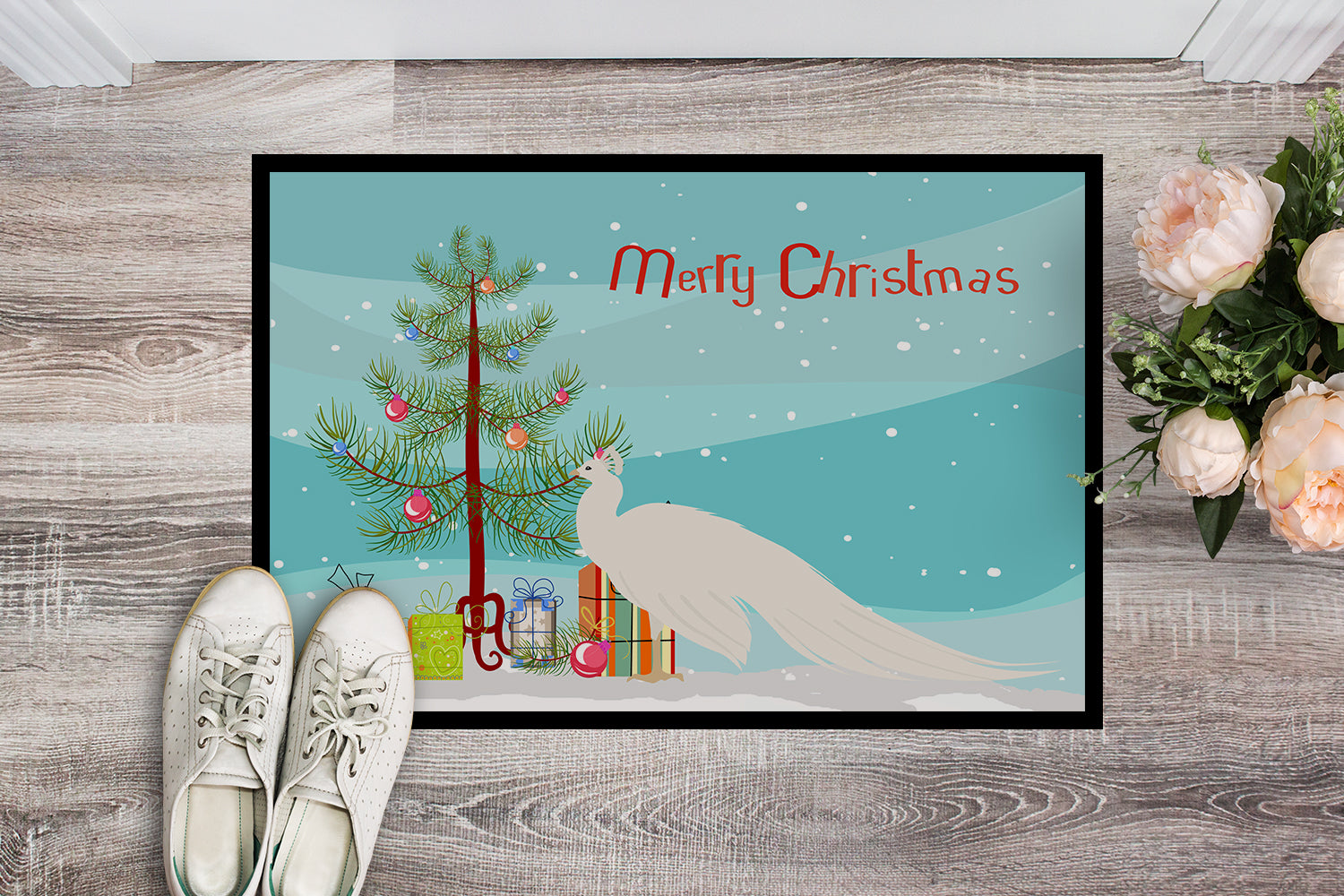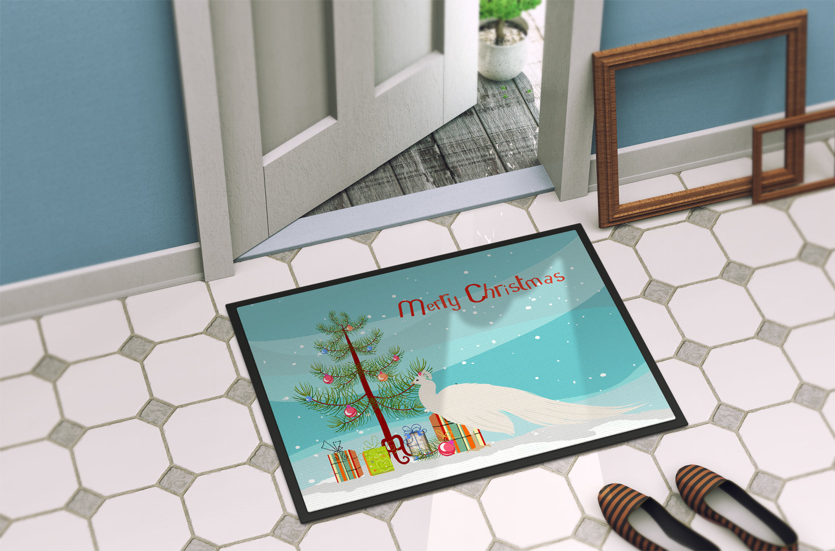 Decorate your space with our Christmas White Peacock Peafowl artwork on a Doormat. Welcome your guests in style with our Artwork Door Mat, designed to withstand almost any weather condition. This mat, measuring approximately 24 by 36 inches, is held together by durable black binding tape. Its top layer, composed of polyester felt, is dyed with the eye-catching image you see on the mat. A few layers below provide the mat with stability, while its rubber bottom is stamped to help prevent slipping and ensures safety. Our mat works wonderfully as both an indoor or outdoor door mat. For cleaning, simply hose it off with water or use a power washer - no need for any cleaner that produces suds. Avoid scrubbing with a brush, instead, opt for the vacuum on floor setting. Designed manufactured and printed in the USA, this mat is a perfect addition to your porch, outdoor kitchen, entryway, or any indoor space. Its unique design makes it a charming decorative rug that greets your guests and adds a stylish touch to your home decor.