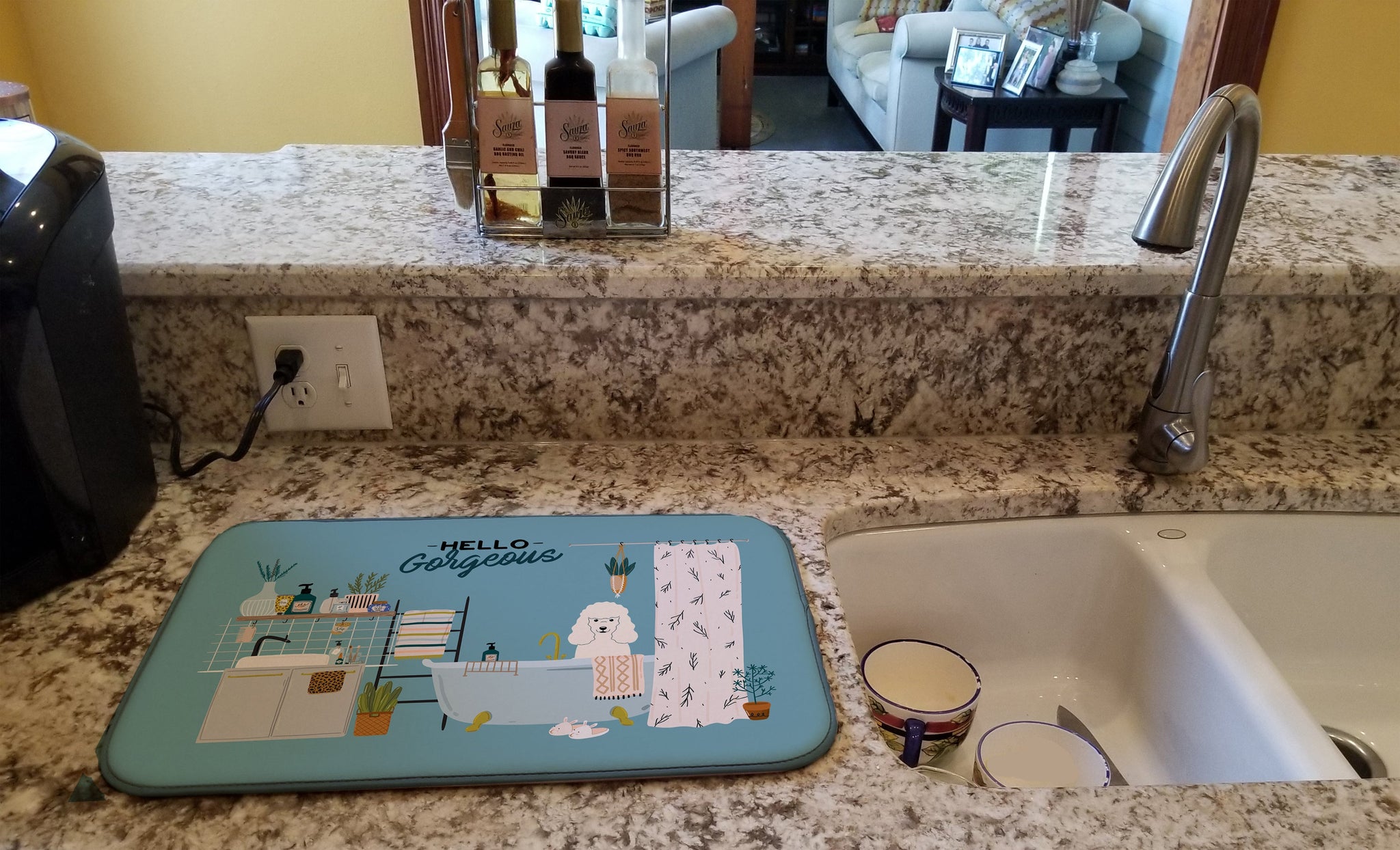 Decorate your space with our Poodle artwork on a Dish Drying Mat. Say goodbye to messy countertops and soggy dish towels with our innovative dish drying mat. Our high-quality dish drying pad is designed to keep your countertops dry while offering a stylish and efficient solution. Whether you're air drying dishes, glasses, stemware, silverware, pots, pans, bottles, or even fruits and vegetables, our dish mat is the perfect choice. The 14 inches x 22 inches size fits most counters and dish drying racks, and the non-slip design ensures stability. Made with water-absorbent polyester and a polyurethane foam insert, our dish drying mat is not only functional but also durable. It's machine washable and printed in the USA for long-lasting use. The beautiful artwork adds flair to your kitchen decor, making it a perfect housewarming gift or present for any occasion. Upgrade your kitchen experience with our absorbent and versatile dish drying mat.