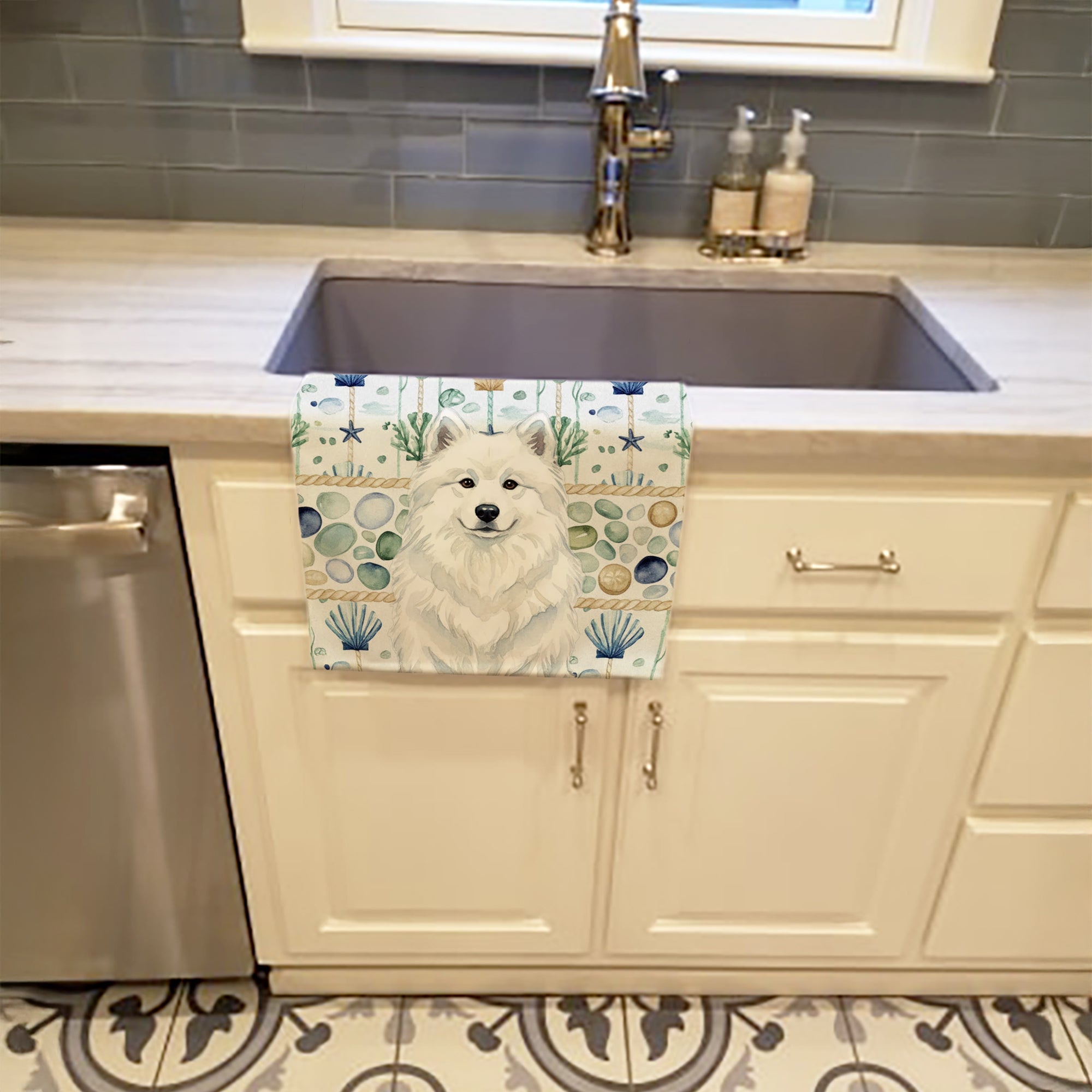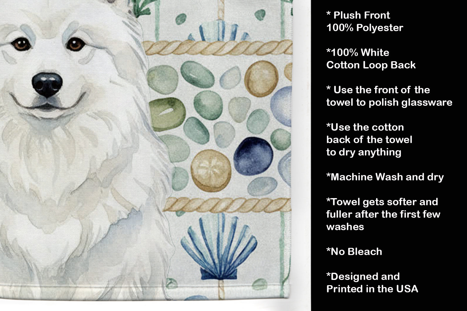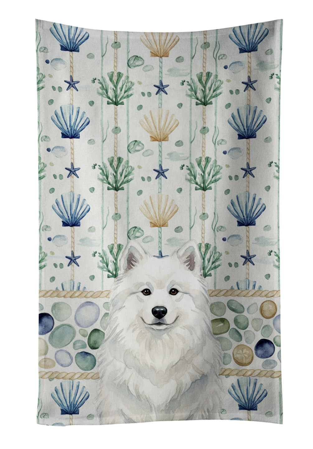 Kitchen Towel featuring breed specific Samoyed artwork. Bring breezy coastal charm to your kitchen or bath with our plush velour towel featuring original watercolor artwork. The soft minky polyester front showcases vivid seashell and starfish designs with a dog portrait, perfect for polishing glassware to a brilliant shine. The 100% cotton terry loop back delivers superior absorbency for drying hands, dishes, or counters. Artwork is dyed directly into the fibers for lasting color that won’t crack or peel. Each towel measures 15" x 25", with bound edges to maintain shape after repeated washes. Machine washable and tumble dry low for easy care. Designed and printed in the USA, these towels combine function and style—ideal for beach homes, coastal kitchens, or as thoughtful gifts.
