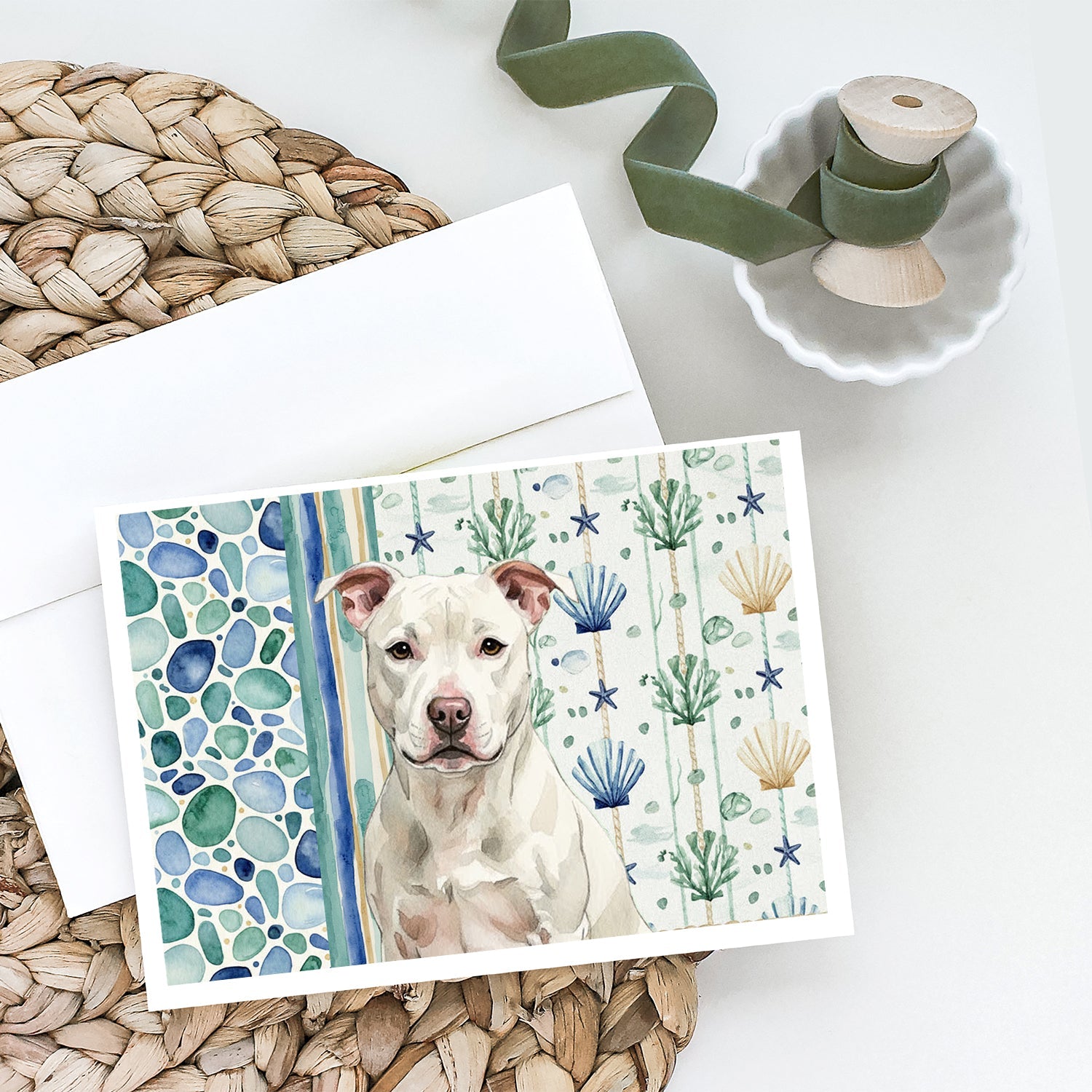 Shown here is the White Staffordshire Bull Terrier Coastal Sea Glass Greeting Cards Pack of 8 from Caroline's Treasures featuring artwork of a Staffordshire Bull Terrier in a Everyday design. The detailed illustration and vibrant colors make it a standout accent that celebrates both seasonal style and love for the subject. This image features a calming coastal watercolor pattern with soft seashells, seaweed, starfish, and pebble-inspired accents arranged in a repeating design. The soothing palette of blues, greens, and sandy neutrals creates a relaxed, beach-inspired look that adds a fresh and tranquil feel to any space. Everyday décor celebrates personal style and the small moments that make a house feel like home. Thoughtful designs add warmth and personality that can be enjoyed year-round. Celebrate special moments with Caroline's Treasures Printed Greeting Card Pack. This pack includes eight beautifully folded 5x7 cards, accompanied by eight matching white envelopes. With blank interiors, these cards provide ample space for your personalized messages and heartfelt holiday greetings. Each card features captivating full-color artwork, meticulously printed in our facility on high-quality 80 lb cover stock or 216 GSM. The super smooth finish of the white cards enhances the visual impact of the artwork, creating a truly stunning presentation. Designed by our talented in-house artists or licensed artists, the artwork on these cards showcases their creativity and attention to detail. From vibrant illustrations to captivating designs, each card tells its own unique story. Whether it's for birthdays, anniversaries, holidays, or any special occasion, Caroline's Treasures Greeting Card Pack is the perfect way to convey your heartfelt sentiments. Share joy, love, and warm wishes with these exquisite cards and make every moment unforgettable. Perfect for: Writing personal messages, everyday correspondence, and thoughtful notes, Dogs-themed stationery collections, or year-round use for Staffordshire Bull Terrier lovers. Staffordshire Bull Terriers are strong dogs known for their affectionate nature and courage. This breed is admired for its loyalty, confidence, and devotion to family. Makes a heartfelt gift for: Staffordshire Bull Terrier owners, Dogs lovers, Everyday gifts, pet parents, friends who adore their Staffordshire Bull Terrier, or anyone celebrating Dogs.