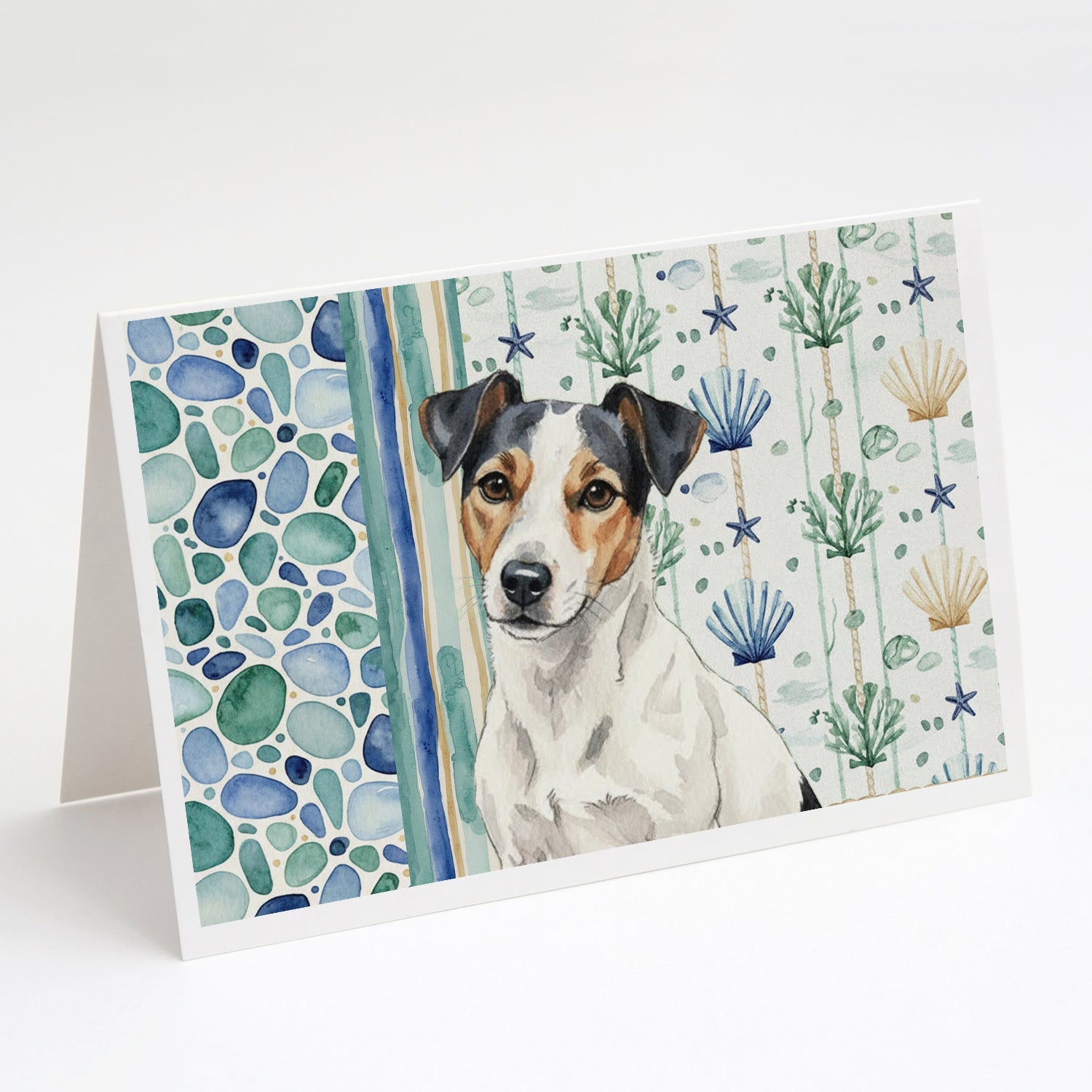 Shown here is the White with Black Markings Russell Terrier Coastal Sea Glass Greeting Cards Pack of 8 from Caroline's Treasures featuring artwork of a Russell Terrier in a Everyday design. The detailed illustration and vibrant colors make it a standout accent that celebrates both seasonal style and love for the subject. This image features a calming coastal watercolor pattern with soft seashells, seaweed, starfish, and pebble-inspired accents arranged in a repeating design. The soothing palette of blues, greens, and sandy neutrals creates a relaxed, beach-inspired look that adds a fresh and tranquil feel to any space. Everyday décor celebrates personal style and the small moments that make a house feel like home. Thoughtful designs add warmth and personality that can be enjoyed year-round. Celebrate special moments with Caroline's Treasures Printed Greeting Card Pack. This pack includes eight beautifully folded 5x7 cards, accompanied by eight matching white envelopes. With blank interiors, these cards provide ample space for your personalized messages and heartfelt holiday greetings. Each card features captivating full-color artwork, meticulously printed in our facility on high-quality 80 lb cover stock or 216 GSM. The super smooth finish of the white cards enhances the visual impact of the artwork, creating a truly stunning presentation. Designed by our talented in-house artists or licensed artists, the artwork on these cards showcases their creativity and attention to detail. From vibrant illustrations to captivating designs, each card tells its own unique story. Whether it's for birthdays, anniversaries, holidays, or any special occasion, Caroline's Treasures Greeting Card Pack is the perfect way to convey your heartfelt sentiments. Share joy, love, and warm wishes with these exquisite cards and make every moment unforgettable. Perfect for: Writing personal messages, everyday correspondence, and thoughtful notes, Dogs-themed stationery collections, or year-round use for Russell Terrier lovers. Russell Terriers are compact dogs with athletic builds. Their appearance reflects energy and confidence. Makes a heartfelt gift for: Russell Terrier owners, Dogs lovers, Everyday gifts, pet parents, friends who adore their Russell Terrier, or anyone celebrating Dogs.