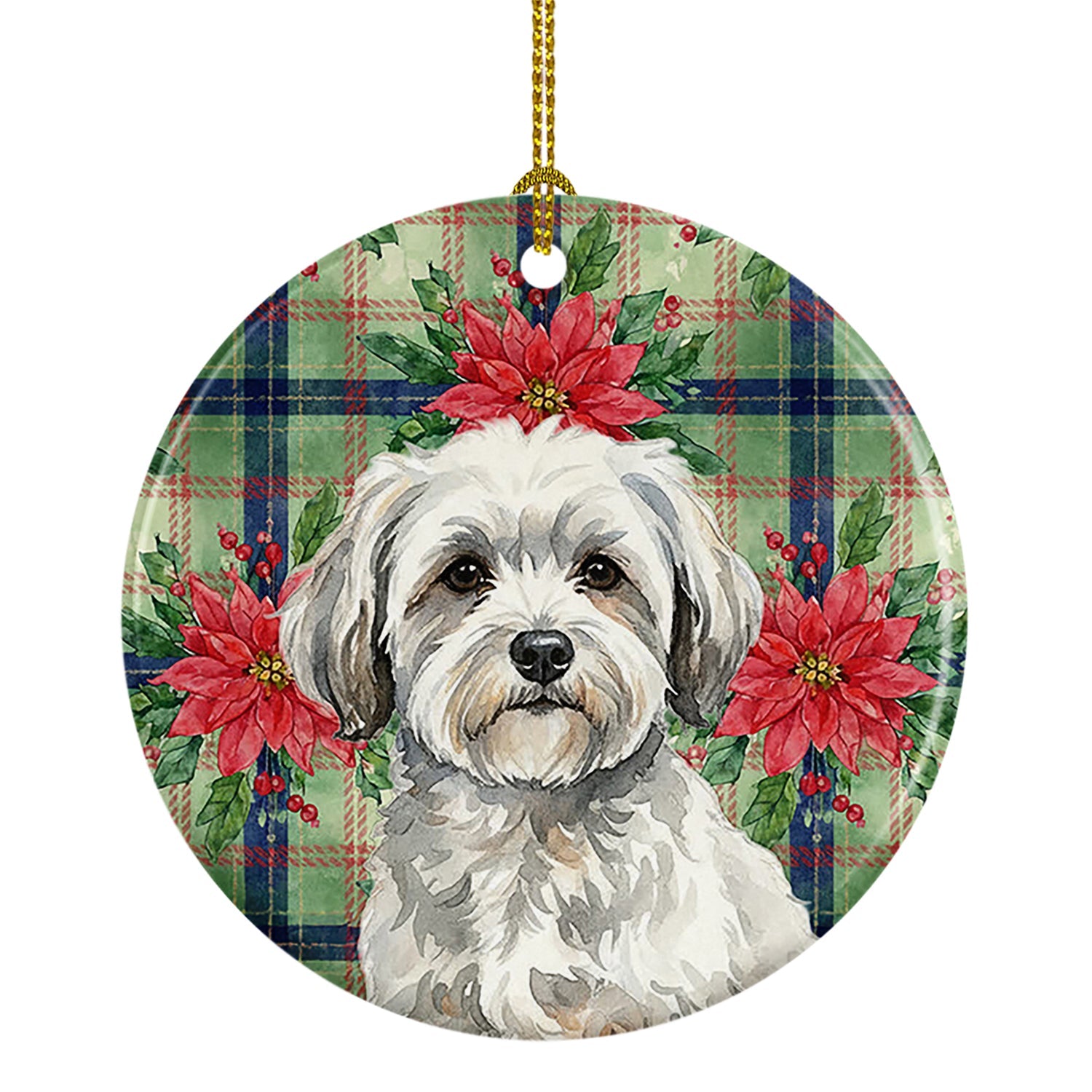 Ceramic Ornament featuring breed specific Coton de Tulear artwork. Celebrate Christmas with this Christmas Ornament. Add a touch of personalized charm to your Christmas tree this holiday season with our Ceramic Ornament. Measuring 2.8125 inches in diameter, this round porcelain ornament beautifully reflects your festive lights, enhancing your holiday decor. The gloss surface sets off the vibrant, full-color artwork contributed by one of our talented artists, bringing a pop of color and joy to your tree. This Ceramic Ornament doesn't stop at being merely decorative. The white back is designed for personalization. Write a heartfelt message, mark a special year, or inscribe a date with a paint pen or a permanent marker to create a treasured memento. Please ensure you allow any personalization to dry thoroughly before handling to maintain the pristine finish. Included with the ornament is a delicate gold cord for easy hanging. Made in the USA, this Ceramic Ornament makes an exceptional gift for a pet sitter, teacher, family member, or anyone you wish to share a little Christmas magic with. With its blend of style, charm, and personal touch, it's a meaningful addition to any Christmas tree.