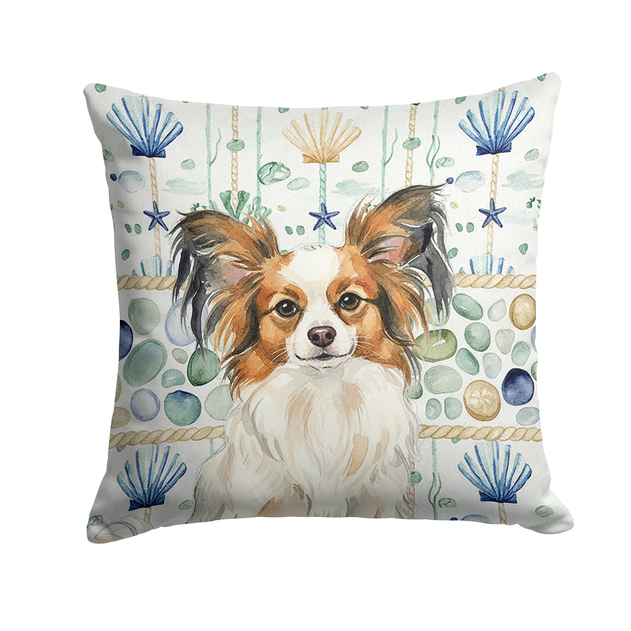 Throw Pillow featuring breed specific Papillon artwork. Revitalize your outdoor or indoor living space with Caroline's Treasures 18x18 Fabric Decorative Pillow. With a generously sized dimension of approximately 18 inches by 18 inches, this pillow makes a comfortable and aesthetic addition to any seating area. Made from a unique, water-resistant material developed by Caroline's Treasures, the pillow sham is 100% polyester fabric that's durable and ready to weather any condition. Its vibrant, full-color artwork will not fade over time as it is dyed with color-fast dyes. Whether you place it on your patio furniture, porch, veranda, or indoor couch, its soft canvas fabric ensures a cozy experience. The pillow is handcrafted in the United States, featuring a sham created from three pieces of fabric and a polyester insert for enduring shape and overstuffed comfort. Despite being robustly built to endure the outdoors, it is as soft and snug as your favorite indoor cushions. Please note, as all our pillows are handmade, sizes may vary slightly, adding to the charm of this unique decorative item.