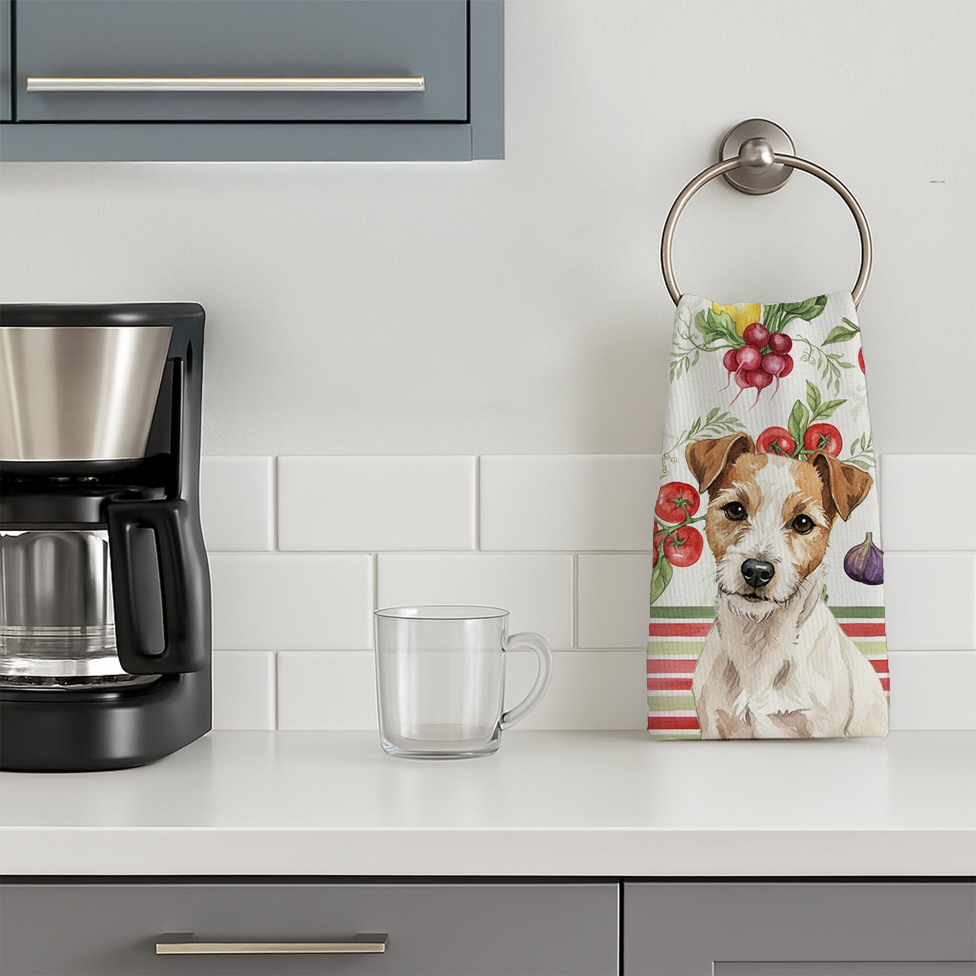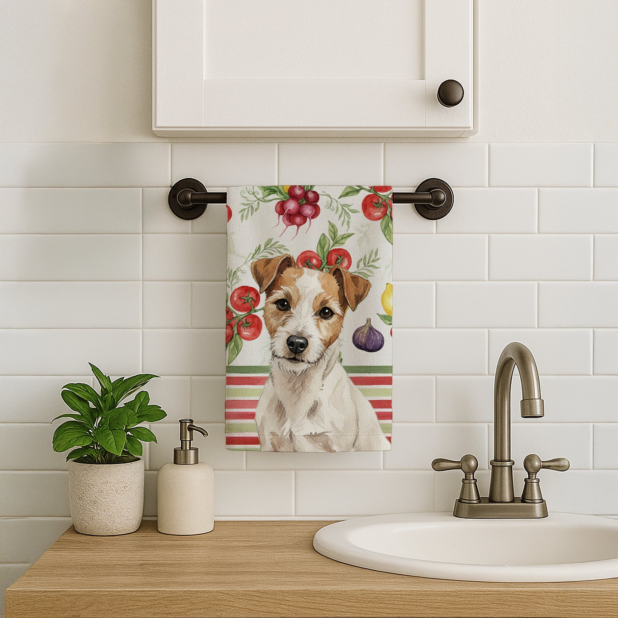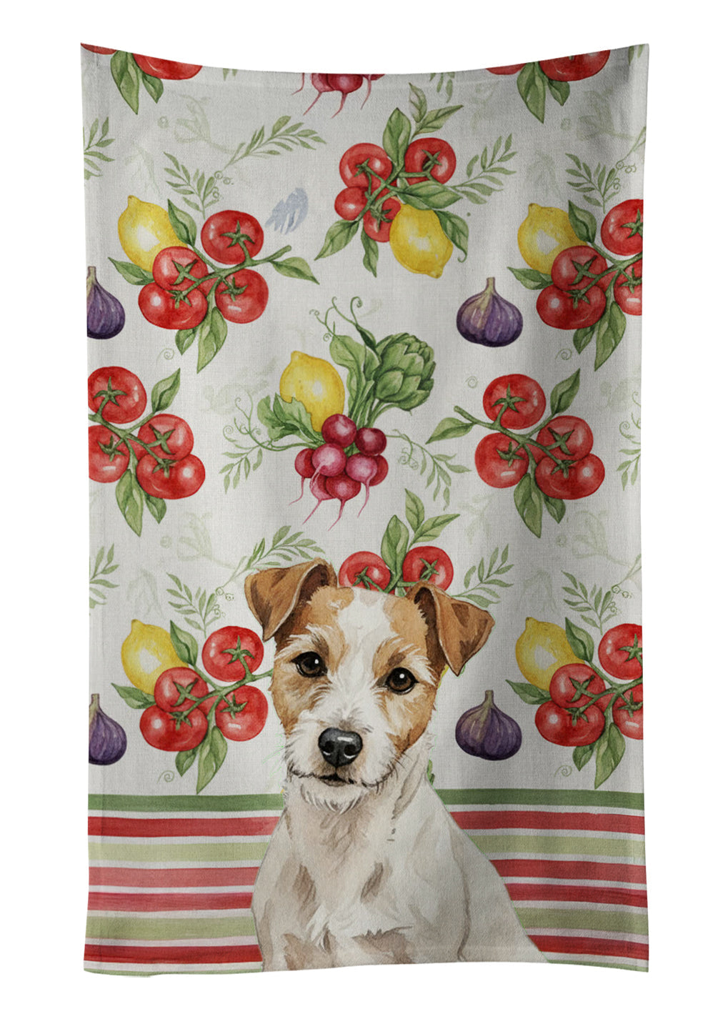 Shown here is the White with Tan Markings Russell Terrier Vegetables Kitchen Towel from Caroline's Treasures featuring artwork of a Russell Terrier in a Everyday design. The detailed illustration and vibrant colors make it a standout accent that celebrates both seasonal style and love for the subject. This image features a vibrant watercolor vegetable pattern with tomatoes, lemons, artichokes, figs, radishes, and leafy greens arranged in a repeating design, paired with classic red and green stripes. The bright, garden-fresh palette creates a cheerful, farmhouse-inspired look that feels lively, welcoming, and perfect for kitchen décor. Everyday décor celebrates personal style and the small moments that make a house feel like home. Thoughtful designs add warmth and personality that can be enjoyed year-round. Bring cozy everyday charm to your sink or powder room with a plush velour towel featuring original watercolor artwork. The front is a soft, color-rich minky polyester that polishes glassware to a brilliant shine; the back is 100% white cotton terry loop for quick absorbency on hands, dishes, and counters. Artwork is dyed into the fibers for lasting color that won’t crack or peel. Finished edges keep the shape wash after wash. Size: 15" x 25". Machine wash; tumble dry low. Designed and printed in the USA. Perfect for: Kitchen counters, ovens, and towel bars, everyday drying and cleanup, -themed kitchens, or year-round use for Russell Terrier lovers. Russell Terriers are compact dogs with athletic builds. Their appearance reflects energy and confidence. Makes a heartfelt gift for: Russell Terrier owners, lovers, Everyday gifts, pet parents, friends who adore their Russell Terrier, or anyone celebrating .