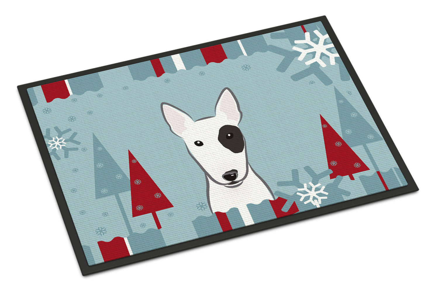 Decorate your space with our Bull Terrier artwork on a Doormat. Bring a bit of Winter into your home with a Winter Doormat. Welcome your guests in style with our Artwork Door Mat, designed to withstand almost any weather condition. This mat, measuring approximately 24 by 36 inches, is held together by durable black binding tape. Its top layer, composed of polyester felt, is dyed with the eye-catching image you see on the mat. A few layers below provide the mat with stability, while its rubber bottom is stamped to help prevent slipping and ensures safety. Our mat works wonderfully as both an indoor or outdoor door mat. For cleaning, simply hose it off with water or use a power washer - no need for any cleaner that produces suds. Avoid scrubbing with a brush, instead, opt for the vacuum on floor setting. Designed manufactured and printed in the USA, this mat is a perfect addition to your porch, outdoor kitchen, entryway, or any indoor space. Its unique design makes it a charming decorative rug that greets your guests and adds a stylish touch to your home decor.