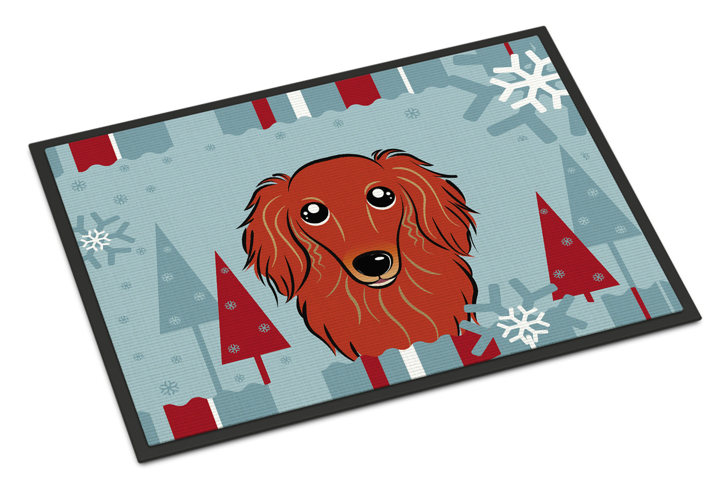 Decorate your space with our Dachshund artwork on a Doormat. Bring a bit of Winter into your home with a Winter Doormat. Welcome your guests in style with our Artwork Door Mat, designed to withstand almost any weather condition. This mat, measuring approximately 24 by 36 inches, is held together by durable black binding tape. Its top layer, composed of polyester felt, is dyed with the eye-catching image you see on the mat. A few layers below provide the mat with stability, while its rubber bottom is stamped to help prevent slipping and ensures safety. Our mat works wonderfully as both an indoor or outdoor door mat. For cleaning, simply hose it off with water or use a power washer - no need for any cleaner that produces suds. Avoid scrubbing with a brush, instead, opt for the vacuum on floor setting. Designed manufactured and printed in the USA, this mat is a perfect addition to your porch, outdoor kitchen, entryway, or any indoor space. Its unique design makes it a charming decorative rug that greets your guests and adds a stylish touch to your home decor.