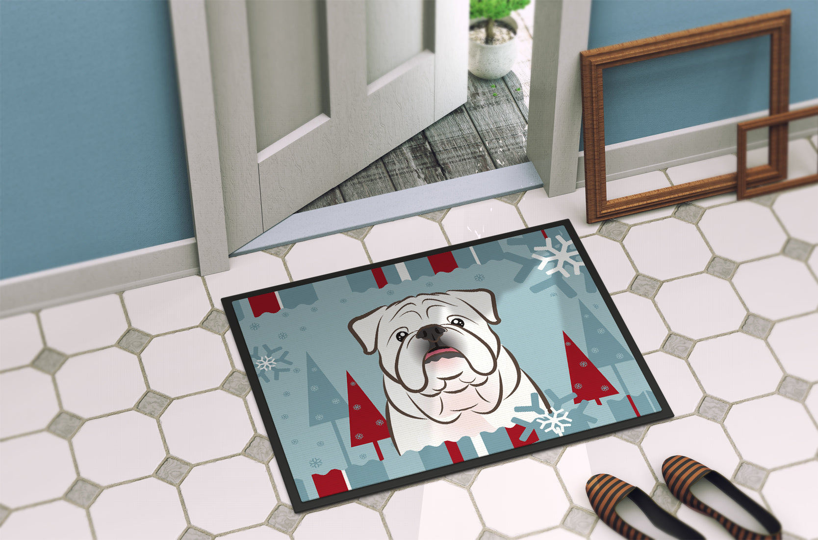 Decorate your space with our Bulldog, English Bulldog artwork on a Doormat. Bring a bit of Winter into your home with a Winter Doormat. Welcome your guests in style with our Artwork Door Mat, designed to withstand almost any weather condition. This mat, measuring approximately 24 by 36 inches, is held together by durable black binding tape. Its top layer, composed of polyester felt, is dyed with the eye-catching image you see on the mat. A few layers below provide the mat with stability, while its rubber bottom is stamped to help prevent slipping and ensures safety. Our mat works wonderfully as both an indoor or outdoor door mat. For cleaning, simply hose it off with water or use a power washer - no need for any cleaner that produces suds. Avoid scrubbing with a brush, instead, opt for the vacuum on floor setting. Designed manufactured and printed in the USA, this mat is a perfect addition to your porch, outdoor kitchen, entryway, or any indoor space. Its unique design makes it a charming decorative rug that greets your guests and adds a stylish touch to your home decor.