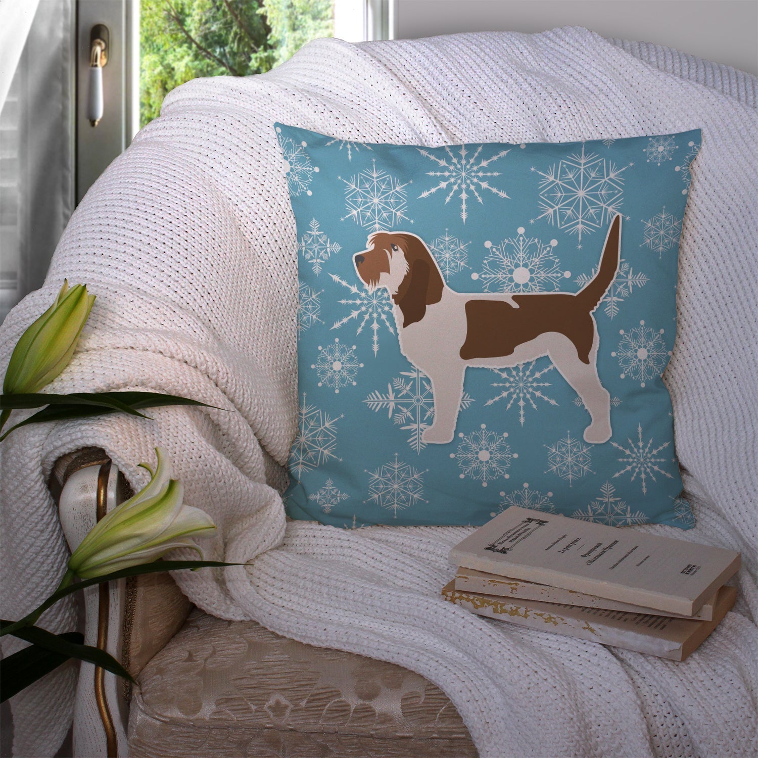 Decorate your space with our Christmas Petit Basset Griffon Vend�en artwork on a Pillow. Bring a bit of Winter into your home with a Winter Pillow. Add a touch of vibrancy and comfort to your outdoor seating with Caroline's Treasures Fabric Decorative Pillow. Measuring approximately 14 inches by 14 inches, this outdoor pillow is crafted to elevate the appeal of your patio furniture, infusing it with vivid color and artistic flair. The pillow includes a 100% Polyester Fabric sham filled with a quality pillow form to provide superior comfort. Innovatively made from our brand new material, specifically woven for its water resistance, this pillow is designed for durability. The soft canvas fabric offers versatility in use, fit for your indoor couch or your outdoor patio, porch, or veranda. The fabric is dyed with colorfast dyes built for resilience against weather conditions, ensuring the pillow retains its beauty over time. Constructed by sewing three fabric pieces to create a sham, the polyester insert is then nestled inside to form the pillow, resulting in an overstuffed pillow that maintains its shape. Both the sham and the pillow insert are proudly made in the United States. As the pillows are handcrafted, there may be minor variations in size, further enhancing their unique charm. Experience comfort in style with Caroline's Treasures Fabric Decorative Pillow.