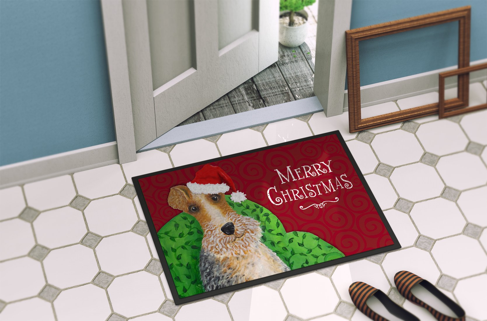 Decorate your space with our Christmas Fox Terrier artwork on a Doormat. Welcome your guests in style with our Artwork Door Mat, designed to withstand almost any weather condition. This mat, measuring approximately 24 by 36 inches, is held together by durable black binding tape. Its top layer, composed of polyester felt, is dyed with the eye-catching image you see on the mat. A few layers below provide the mat with stability, while its rubber bottom is stamped to help prevent slipping and ensures safety. Our mat works wonderfully as both an indoor or outdoor door mat. For cleaning, simply hose it off with water or use a power washer - no need for any cleaner that produces suds. Avoid scrubbing with a brush, instead, opt for the vacuum on floor setting. Designed manufactured and printed in the USA, this mat is a perfect addition to your porch, outdoor kitchen, entryway, or any indoor space. Its unique design makes it a charming decorative rug that greets your guests and adds a stylish touch to your home decor.