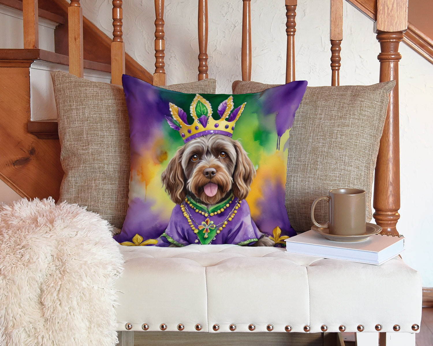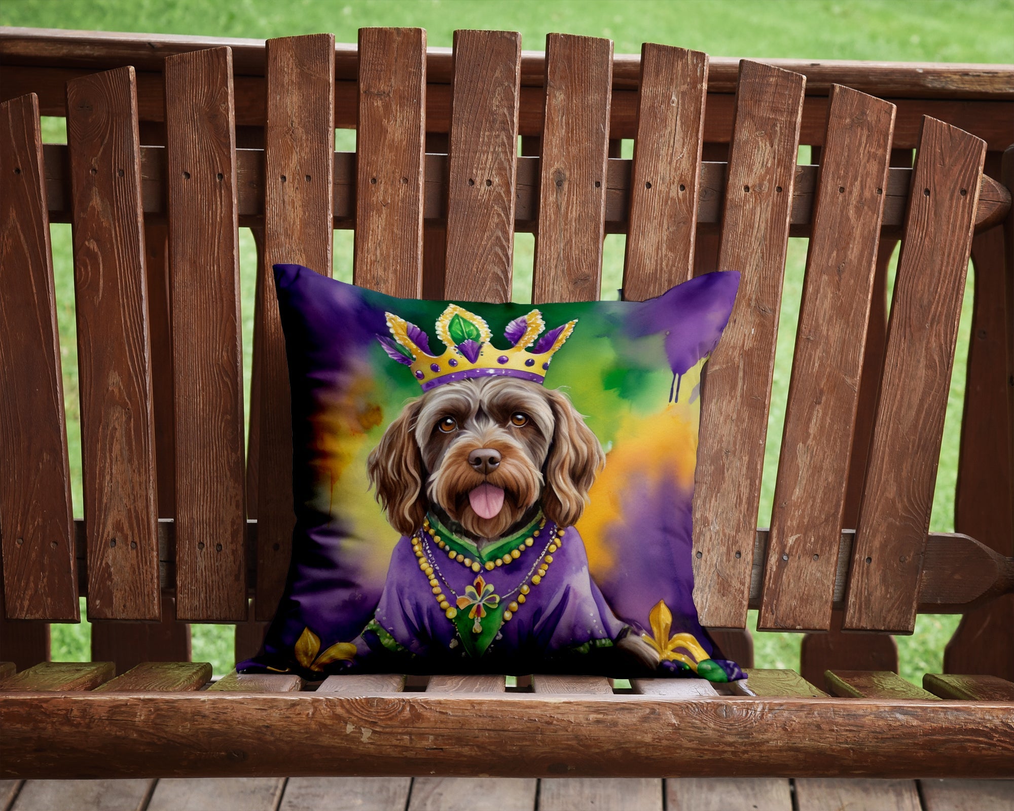 Throw Pillow featuring breed specific Wirehaired Pointing Griffon artwork. Celebrate Mardi Gras with this Mardi Gras Pillow. Add a touch of vibrancy and comfort to your outdoor seating with Caroline's Treasures Fabric Decorative Pillow. Measuring approximately 14 inches by 14 inches, this outdoor pillow is crafted to elevate the appeal of your patio furniture, infusing it with vivid color and artistic flair. The pillow includes a 100% Polyester Fabric sham filled with a quality pillow form to provide superior comfort. Innovatively made from our brand new material, specifically woven for its water resistance, this pillow is designed for durability. The soft canvas fabric offers versatility in use, fit for your indoor couch or your outdoor patio, porch, or veranda. The fabric is dyed with colorfast dyes built for resilience against weather conditions, ensuring the pillow retains its beauty over time. Constructed by sewing three fabric pieces to create a sham, the polyester insert is then nestled inside to form the pillow, resulting in an overstuffed pillow that maintains its shape. Both the sham and the pillow insert are proudly made in the United States. As the pillows are handcrafted, there may be minor variations in size, further enhancing their unique charm. Experience comfort in style with Caroline's Treasures Fabric Decorative Pillow.
