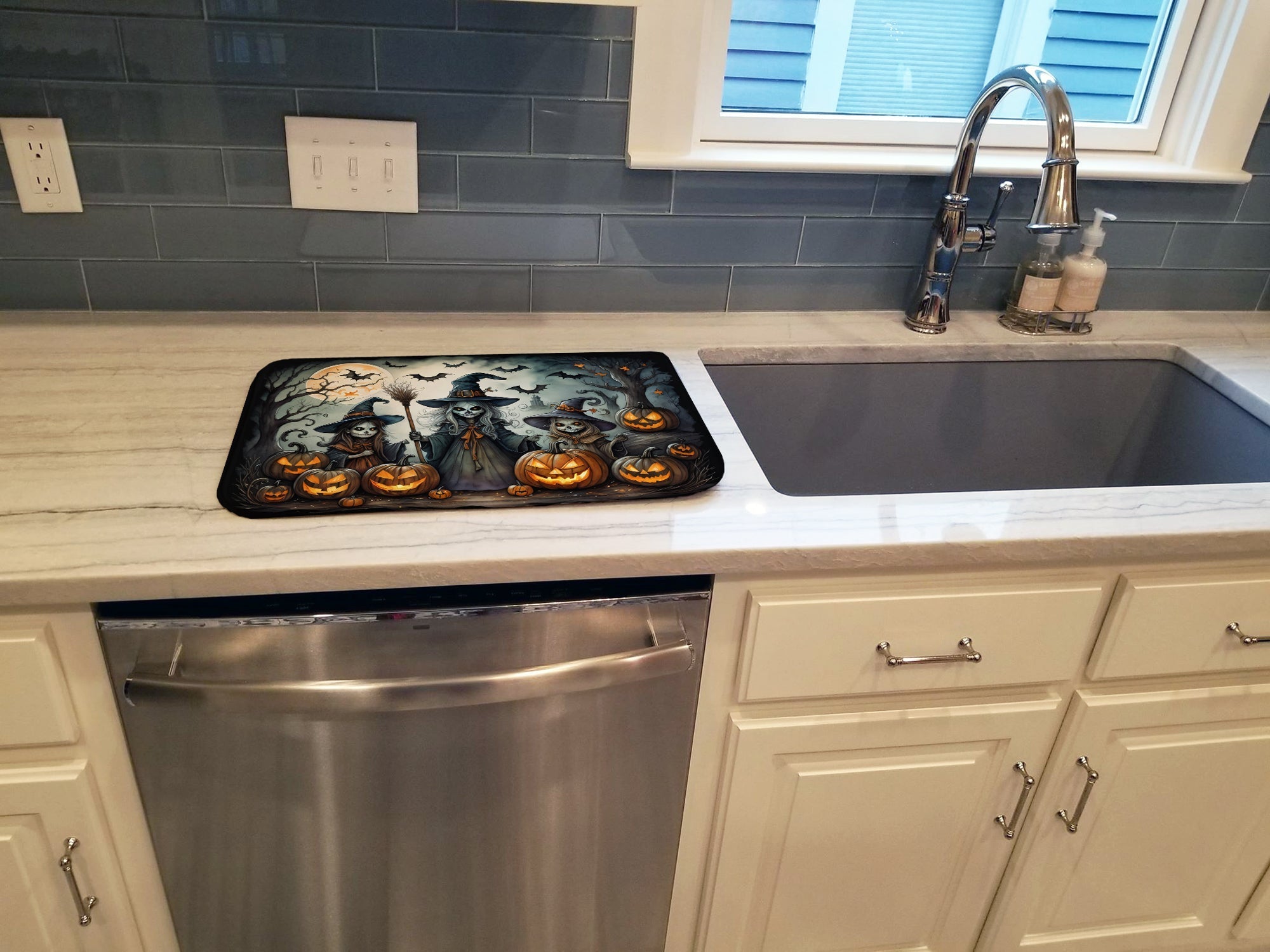 Celebrate Halloween with this Halloween Dish Drying Mat. Say goodbye to messy countertops and soggy dish towels with our innovative dish drying mat. Our high-quality dish drying pad is designed to keep your countertops dry while offering a stylish and efficient solution. Whether you're air drying dishes, glasses, stemware, silverware, pots, pans, bottles, or even fruits and vegetables, our dish mat is the perfect choice. The 14 inches x 22 inches size fits most counters and dish drying racks, and the non-slip design ensures stability. Made with water-absorbent polyester and a polyurethane foam insert, our dish drying mat is not only functional but also durable. It's machine washable and printed in the USA for long-lasting use. The beautiful artwork adds flair to your kitchen decor, making it a perfect housewarming gift or present for any occasion. Upgrade your kitchen experience with our absorbent and versatile dish drying mat.