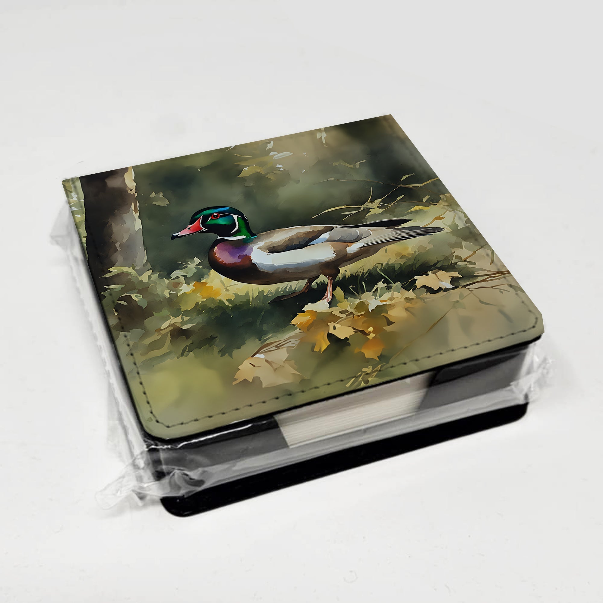 PU Leather Note Paper Holder featuring breed specific Wood Duck artwork. Elevate your workspace with this PU Leather Note Paper Holder, crafted to resemble luxurious leather without the use of animal products. Made from durable synthetic PU leather, it offers both a premium look and eco-friendly appeal. This note holder, compactly sized at 4.25 x 4.25 x 1.25 inches, includes about 160 sheets of 3.75 x 3.75-inch note paper—ideal for quick notes and reminders. An exclusive artist-designed cover makes each holder uniquely vibrant, adding a splash of color and personality to any desk or office. The discrete design keeps note paper hidden, maintaining a neat and organized workspace. Perfect as a gift or for personal use, this stylish holder is refillable with standard paper, ensuring long-lasting utility. A must-have for anyone seeking a sophisticated, artful touch to their workspace while supporting animal-friendly products. Add style, organization, and creativity to your everyday routine with this elegant note paper holder.