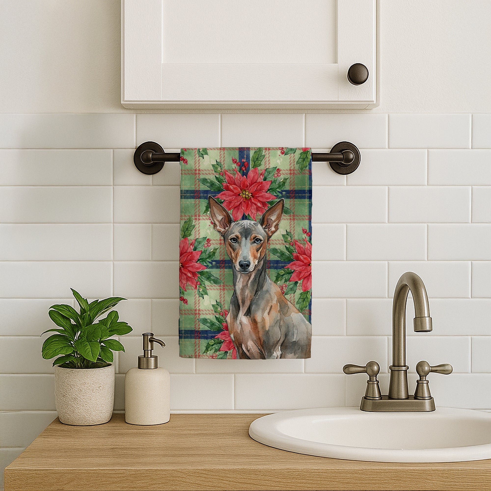 Kitchen Towel featuring breed specific Xoloitzcuintli artwork. Celebrate Christmas with this Christmas Kitchen Towel. Bring cozy holiay charm to your sink or powder room with a plush velour towel featuring original watercolor artwork. The front is a soft, color-rich minky polyester that polishes glassware to a brilliant shine; the back is 100% white cotton terry loop for quick absorbency on hands, dishes, and counters. Artwork is dyed into the fibers for lasting color that won’t crack or peel. Finished edges keep the shape wash after wash. Size: 15" x 25". Machine wash; tumble dry low. Designed and printed in the USA.