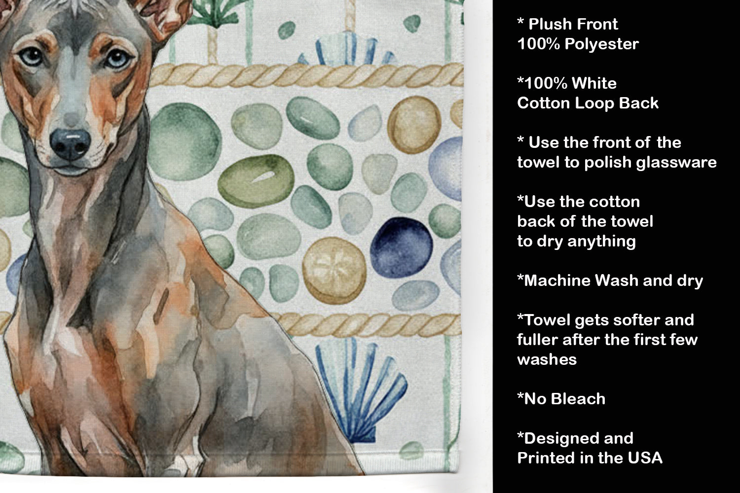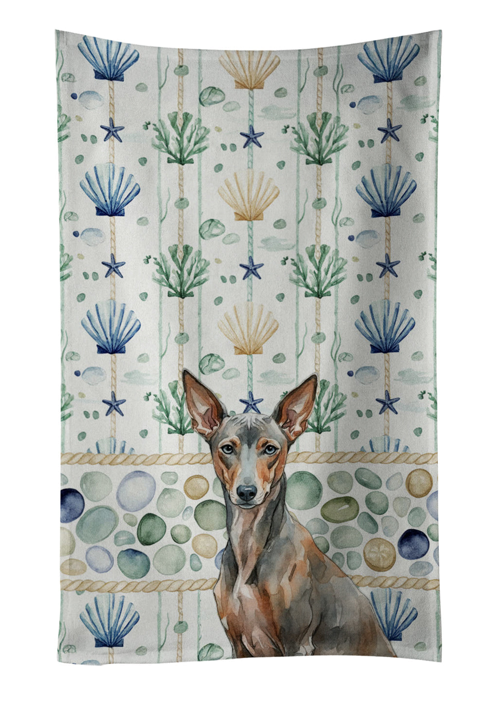 Kitchen Towel featuring breed specific Xoloitzcuintli artwork. Bring breezy coastal charm to your kitchen or bath with our plush velour towel featuring original watercolor artwork. The soft minky polyester front showcases vivid seashell and starfish designs with a dog portrait, perfect for polishing glassware to a brilliant shine. The 100% cotton terry loop back delivers superior absorbency for drying hands, dishes, or counters. Artwork is dyed directly into the fibers for lasting color that won’t crack or peel. Each towel measures 15" x 25", with bound edges to maintain shape after repeated washes. Machine washable and tumble dry low for easy care. Designed and printed in the USA, these towels combine function and style—ideal for beach homes, coastal kitchens, or as thoughtful gifts.