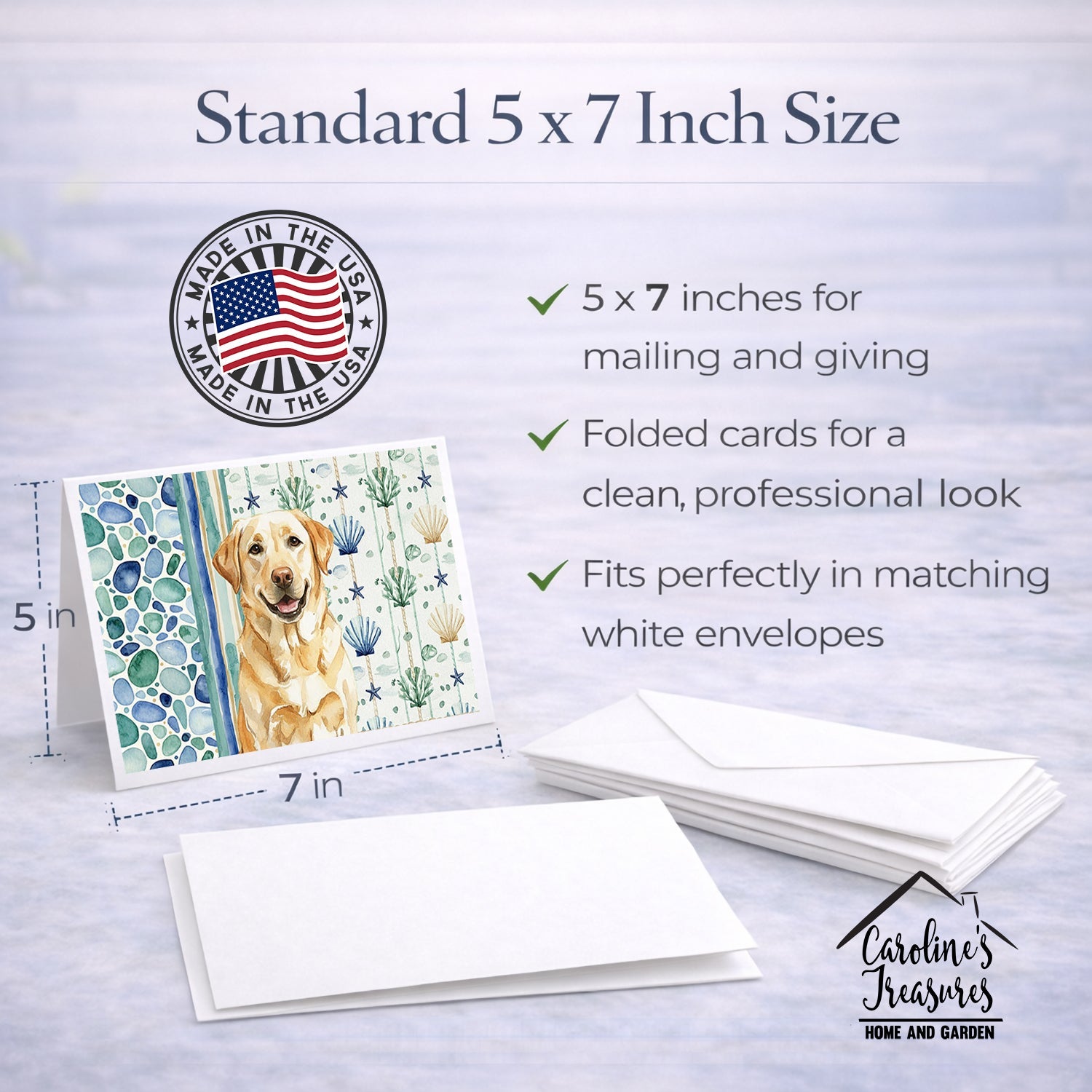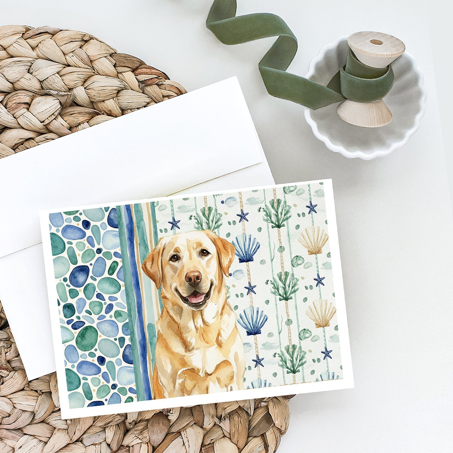 Shown here is the Yellow Labrador Retriever Coastal Sea Glass Greeting Cards Pack of 8 from Caroline's Treasures featuring artwork of a Labrador Retriever in a Everyday design. The detailed illustration and vibrant colors make it a standout accent that celebrates both seasonal style and love for the subject. This image features a calming coastal watercolor pattern with soft seashells, seaweed, starfish, and pebble-inspired accents arranged in a repeating design. The soothing palette of blues, greens, and sandy neutrals creates a relaxed, beach-inspired look that adds a fresh and tranquil feel to any space. Everyday décor celebrates personal style and the small moments that make a house feel like home. Thoughtful designs add warmth and personality that can be enjoyed year-round. Celebrate special moments with Caroline's Treasures Printed Greeting Card Pack. This pack includes eight beautifully folded 5x7 cards, accompanied by eight matching white envelopes. With blank interiors, these cards provide ample space for your personalized messages and heartfelt holiday greetings. Each card features captivating full-color artwork, meticulously printed in our facility on high-quality 80 lb cover stock or 216 GSM. The super smooth finish of the white cards enhances the visual impact of the artwork, creating a truly stunning presentation. Designed by our talented in-house artists or licensed artists, the artwork on these cards showcases their creativity and attention to detail. From vibrant illustrations to captivating designs, each card tells its own unique story. Whether it's for birthdays, anniversaries, holidays, or any special occasion, Caroline's Treasures Greeting Card Pack is the perfect way to convey your heartfelt sentiments. Share joy, love, and warm wishes with these exquisite cards and make every moment unforgettable. Perfect for: Writing personal messages, everyday correspondence, and thoughtful notes, Dogs-themed stationery collections, or year-round use for Labrador Retriever lovers. Labrador Retrievers are strong dogs with kind expressions. Their appearance reflects loyalty and reliability. Makes a heartfelt gift for: Labrador Retriever owners, Dogs lovers, Everyday gifts, pet parents, friends who adore their Labrador Retriever, or anyone celebrating Dogs.