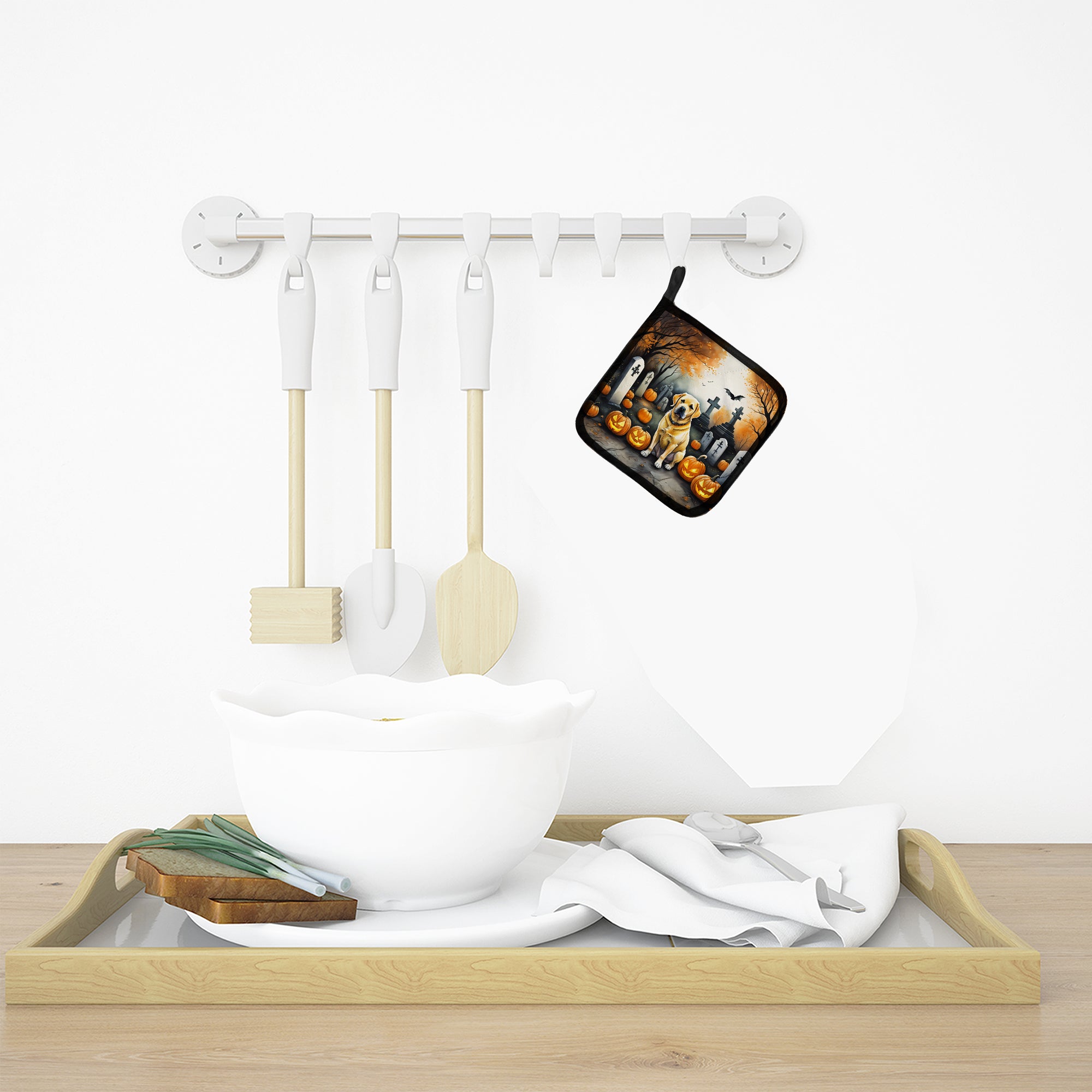Decorate your space with our Halloween Labrador Retriever artwork on a Pair of Pot Holders. A Pair of Pot Holders to match your kitchen decor. Made in the USA these are thick and functional. Full color artwork decorates the front polyester fabric of the hot pad and accented by a black trim. Use these at as a trivet for your Thanksgiving or Christmas tablescape. Filled with insulated fabric and quilted for durability. These colorful pot holders will make a great gift for your favorite home cook or executive chef. Each pot holder measures approximately 7 1/2 inches by 7 1/2 inches. A hanging tab is included.