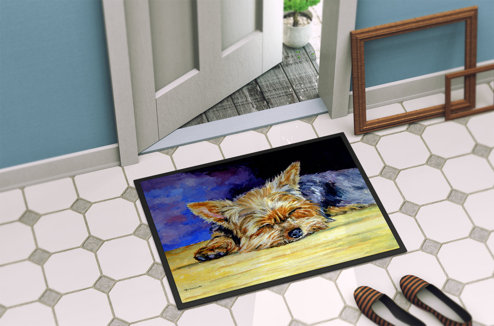 Decorate your space with our Yorkshire Terrier artwork on a Doormat. Welcome your guests in style with our Artwork Door Mat, designed to withstand almost any weather condition. This mat, measuring approximately 18 by 27 inches, is held together by durable black binding tape. Its top layer, composed of polyester felt, is dyed with the eye-catching image you see on the mat. A few layers below provide the mat with stability, while its rubber bottom is stamped to help prevent slipping and ensures safety. Our mat works wonderfully as both an indoor or outdoor door mat. For cleaning, simply hose it off with water or use a power washer - no need for any cleaner that produces suds. Avoid scrubbing with a brush, instead, opt for the vacuum on floor setting. Designed manufactured and printed in the USA, this mat is a perfect addition to your porch, outdoor kitchen, entryway, or any indoor space. Its unique design makes it a charming decorative rug that greets your guests and adds a stylish touch to your home decor.