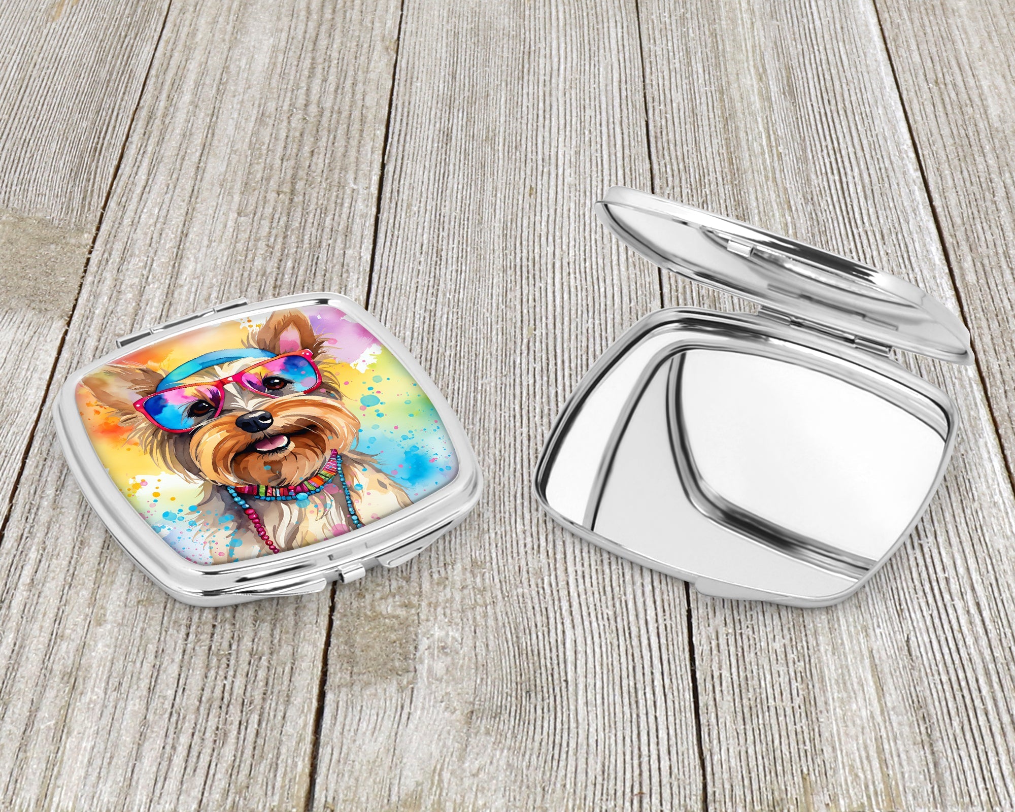 Decorate your space with our Yorkshire Terrier artwork on a Compact Mirror. Bring a bit of Summer into your home with a Summer Compact Mirror. Introducing our Square Compact Mirror, a blend of elegance, functionality, and compactness, perfect for on-the-go touch-ups. This Silvertone metal mirror, with dimensions of 2.75 inches x 3 inches x .3 inches, fits effortlessly into your purse, handbag, or pocket, ensuring that you can check your appearance anytime, anywhere. Our compact mirror stands out with its eye-catching artwork on the front, adding a dash of style to this practical accessory. It is more than just a mirror; it's a statement piece that reflects your personality and aesthetic. When opened, this compact reveals two mirrors inside, doubling your perspective for precise touch-ups. The Silvertone metal construction ensures durability while maintaining a lightweight feel, making it an ideal everyday carry item. Whether you're rushing to a meeting, prepping for a dinner date, or just need a quick check on your look, our Square Compact Mirror is your reliable companion. Experience the perfect blend of style and practicality with this must-have accessory.
