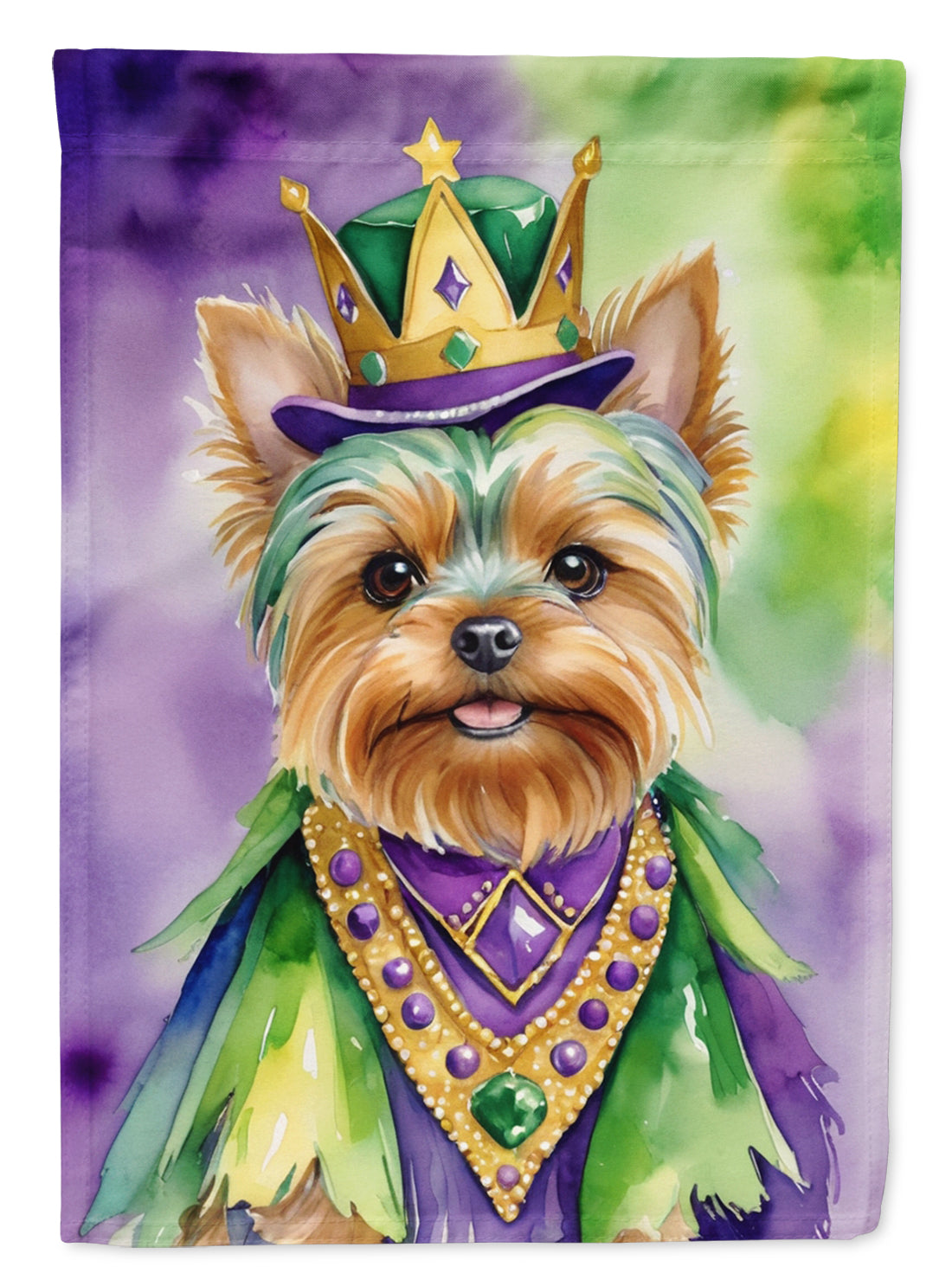 Decorate your space with our Mardi Gras Yorkshire Terrier Yorkie artwork on a Garden Flag. Enhance the beauty of your garden, patio, or yard with Caroline's Treasures Decorative Garden Flag, proudly made in the USA. Crafted from two pieces of thick, double-sided polyester fabric, this 2-ply garden flag is designed to withstand various weather conditions, making it water-resistant and weatherproof. Featuring correctly readable words on both sides, this garden flag offers a delightful visual experience from any angle. With its heavier weight, it stands out among other garden flags, ensuring stability and durability even in wind, rain, and snow. Measuring approximately 11 1/4 inches by 15 1/2 inches, this flag allows you to personalize your outdoor decor. It comes with a 1 1/2-inch sleeve sewn in, allowing easy attachment to any standard garden flag stand or garden size porch hanger (sold separately). Make a statement in your outdoor space with Caroline's Treasures Decorative Garden Flag, a vibrant and high-quality flag that adds color and personality to your surroundings. Proudly made in the USA, it's a symbol of quality craftsmanship and attention to detail.